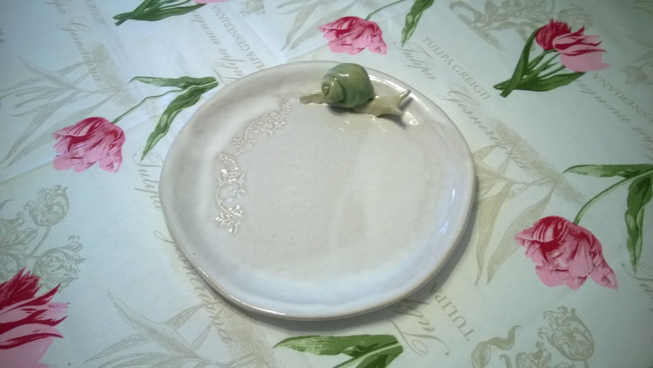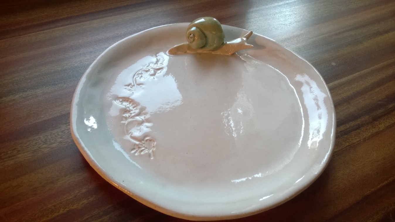 Snigeln är lyckligt hemkommen. Snäckan exploderade inte i ugnen och färgerna är över förväntan jämna och fina. Hurra! Det knepiga med keramik är ju – i alla fall för mig som är amatör – att jag aldrig riktigt vet hur det färdiga resultatet kommer att se ut.