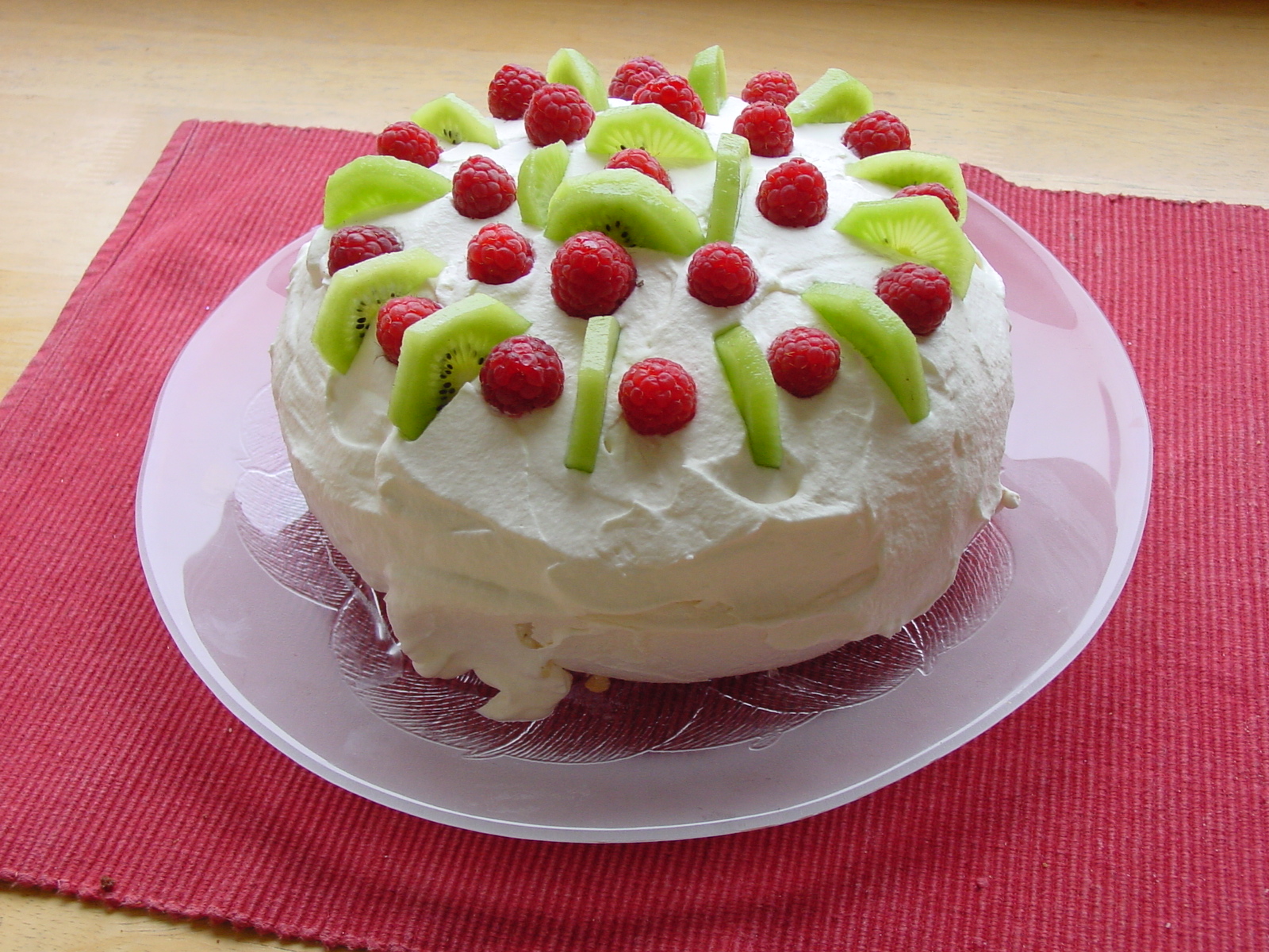 ”Vintern raaaasat ut bland våra fjällar” ekar det snart runtom i landet. Som efterrätt på valborgs-supébordet eller första maj-brunschen kan man mycket väl servera en vårig, fräsch pavlova-kaka. Själv gjorde jag den till påsk, vilket också fungerade utmärkt. Traditionellt garneras bakelsen med jordgubbar och kiwi, men jag bytte ut jordgubbarna mot hallon. Det här gör man naturligtvis precis hur man vill. Det är egentligen en ganska enkel kaka att laga, det mest kritiska är att marängbottnen inte får falla ihop när man gräddat den. Tricket är att inte ta ut den ur ugnen innan den har svalnat helt. Pavlovan är, sitt rysk-klingande namn till trots, en austaliensisk (eller nyzeeländsk, de båda länderna strider om vem som egentligen är upphovsland) skapelse. Mer om detta kan man läsa här.