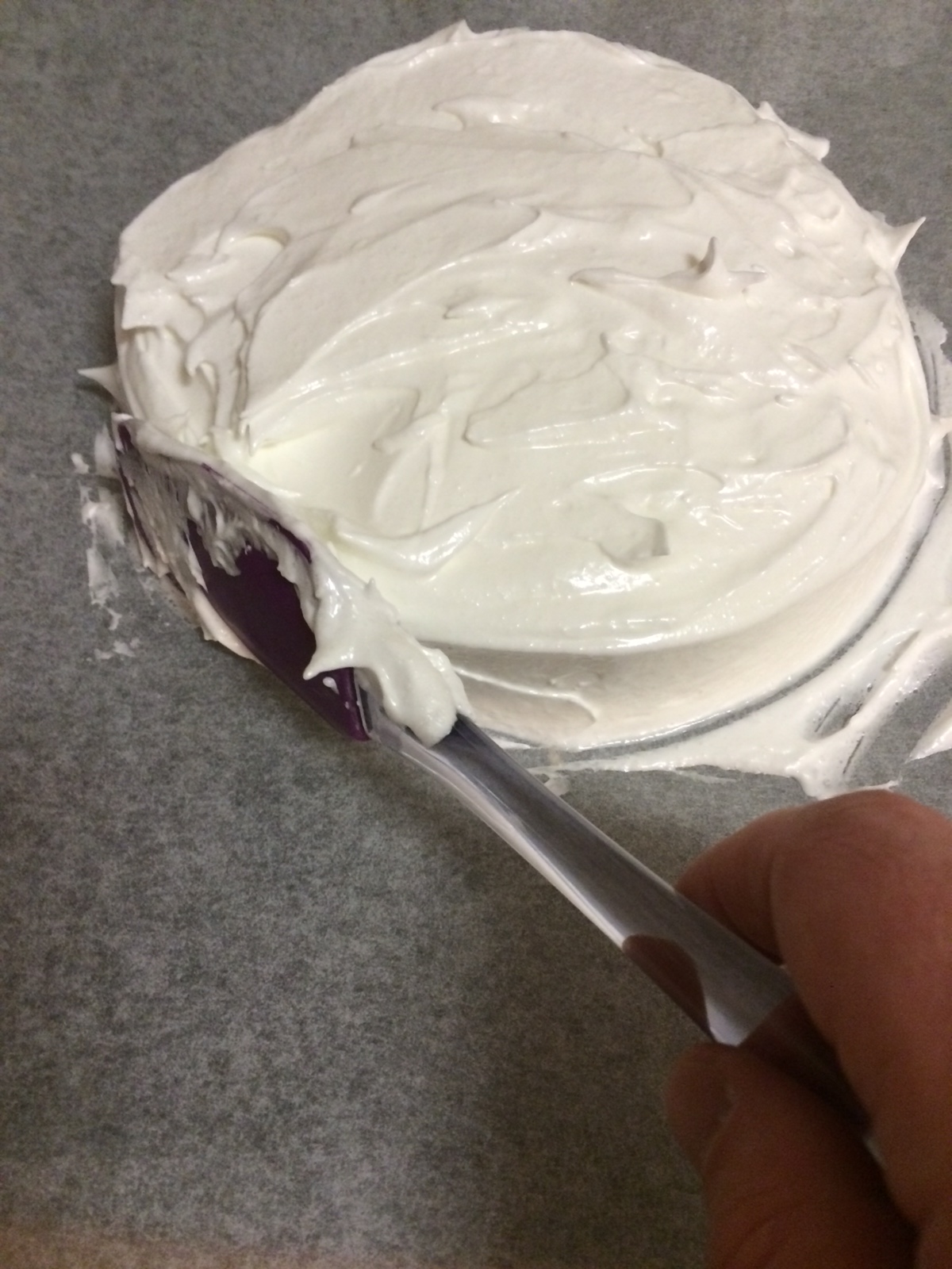 Sätt ugnen på 225 grader. Vispa äggvitorna hårt, så hårt att du kan vända bunken upp och ner utan att smeten faller ut. Tillsätt socker och vispa ännu lite. Vispa i majsstärkelse, vaniljsocker och vinäger/citronsaft. Lägg upp smeten på en bakplåt klädd med bakplåtspapper och forma till en snygg, ca 5-7 cm hög marängkaka.