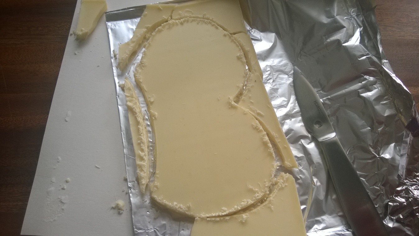 Jag började med att skära ut vingar ur den vita chokladen. Det lyckades bra och var enklare än jag trodde! Bara rista in konturerna med en liten, vass kniv, och skär sedan i konturerna några gånger, djupare ner för varje gång. Jag använde en kräftkniv för det var den jag råkade få i handen, och det funkade bra. Se bara till att ha tunna chokladplattor.