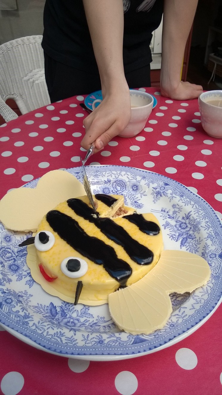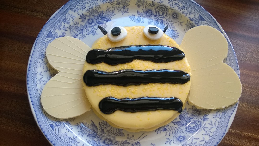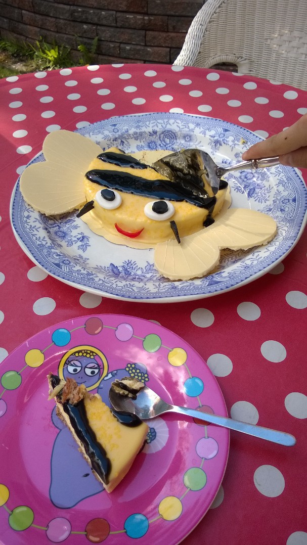 Den här humlekakan är perfekt att sjunga upp ett födelsedagsbarn med, eller att avnjuta annars bara, t.e.x. i trädgården, som vi gjorde. Barnen fick fungera som provkaniner. Jag hittade en fryst kaka som jag gillade den gula färgen på. Smaken visste jag ingenting om i förväg, annat än vad det stod på förpackningen så klart: ”Almondy”, och ”Lovely Lemon Curd med frisk citronkräm och fräsch mousse”. Men jag visste genast att jag ville göra en humla. (Andra alternativet skulle ha varit en glad sol)