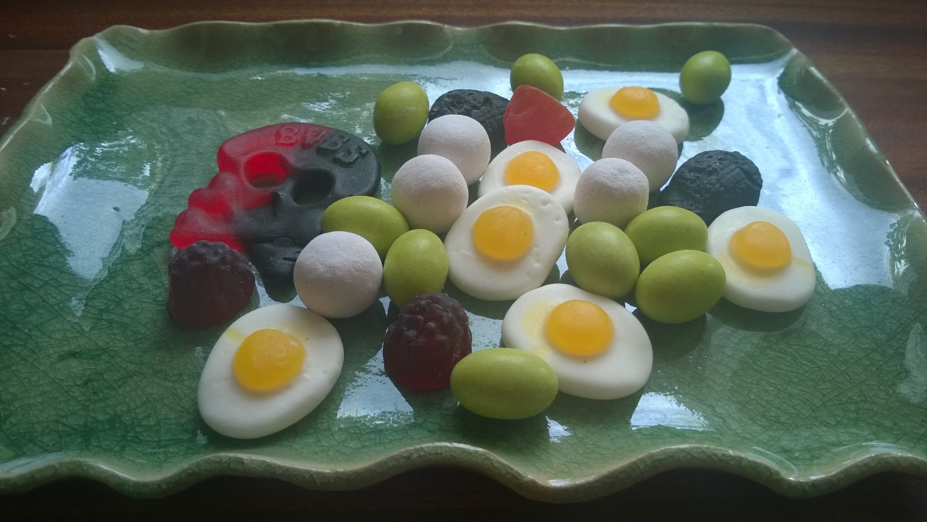 - lösgodis: 2 platta ägg, en rödsvart döskalle