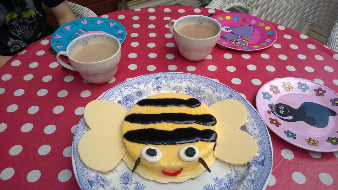 Det var vackert väder, så vi tog ut tårtan i trädgården. Det såg ut som ett barnkalas….