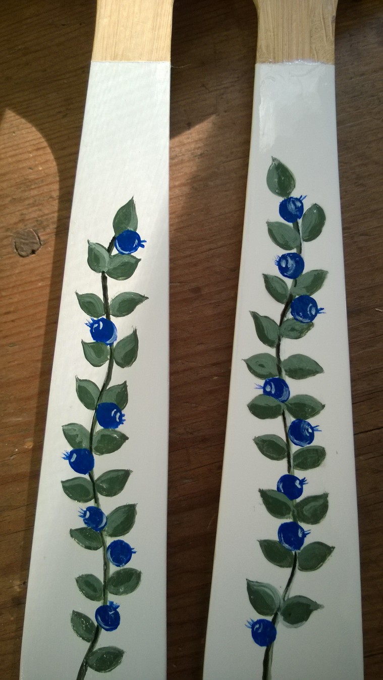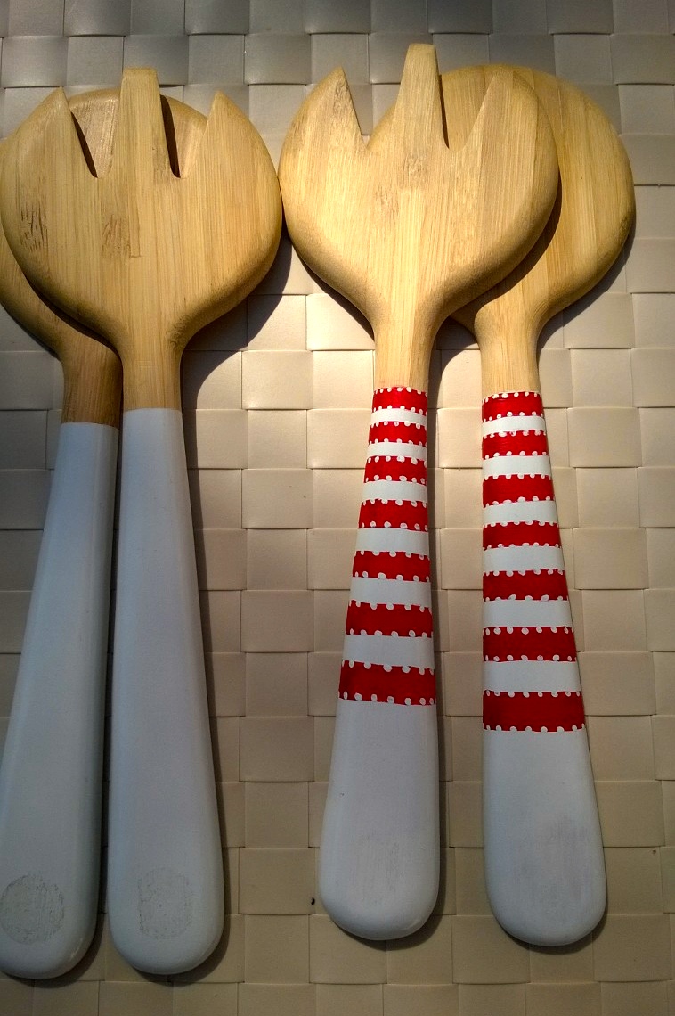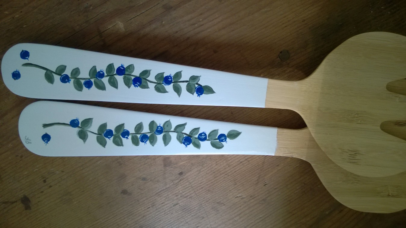 Min vän Tiina tipsade mig om att Ikea har salladsbestick i trä för 3,90€ som lämpar sig för dekorationsmålning, och så tipsade hon mig om att jag kunde måla något trevligt på hennes bestick som hon redan köpt åt sig…haha! Men jag höll ju med, det skulle vara lätt att göra besticken mer personliga med lite färg. Så jag for till Ikea och köpte ett par åt mig själv också och började måla. Jag brukar använda vattenlöslig hobbyfärg av märket ”Allmogefärg” när jag målar på trä, på finska står det ”Akryyliväri” på etiketten. Lackade till sist med ett vattenlösligt klarlack (Pentart, ”Glossy Varnish”), som tål vatten efter att det torkat.