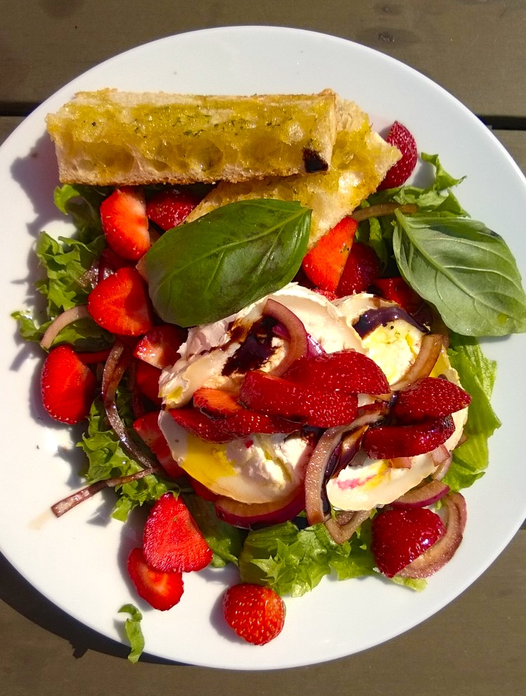 Jag kom att tänka på en härlig sallad jag blev serverad senaste sommar i Skärgårdsbutiken på Sommaröarna i Esbo. Den var jättegod och dessutom snygg att se på, så jag fotade den. Ska försöka göra en liknande nu när man får jordgubbar igen.