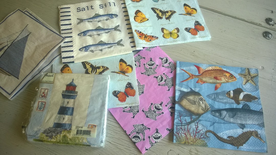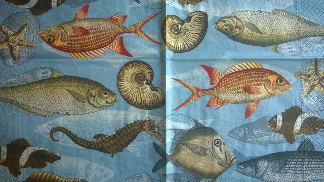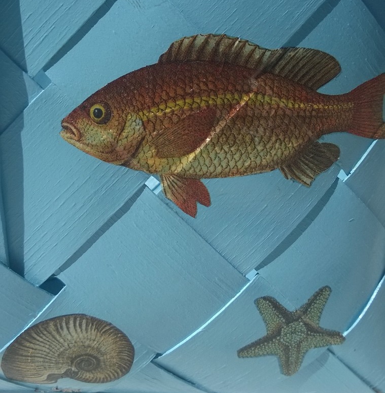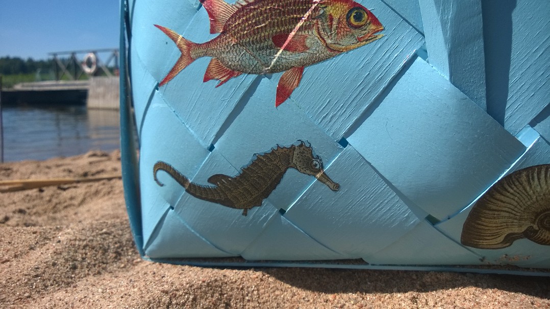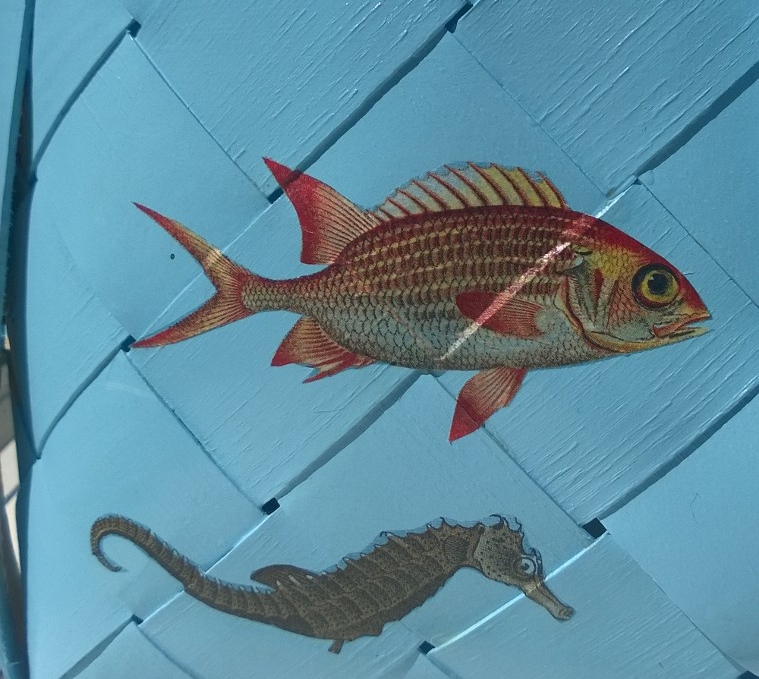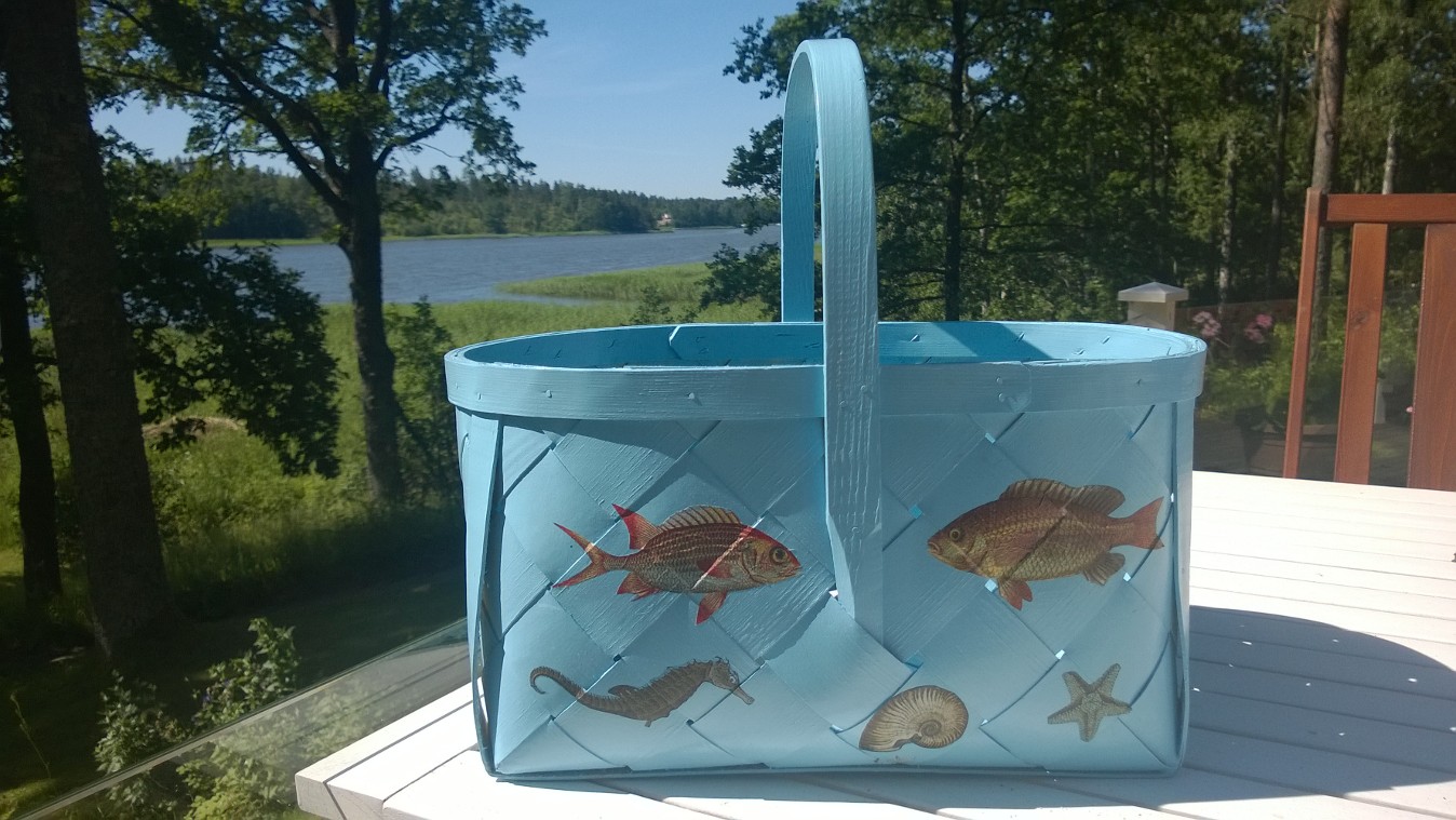 Fiskarna, sjöhästarna och snäckorna är utklippta ur servetter och limmade på en korg som grundmålats med oljebaserad färg (t.ex Empire eller Allbäck). Omålade pärtkorgar hittar man ofta på marknader. De brukar kosta runt 30 € men köper man fler får man pruta mer…