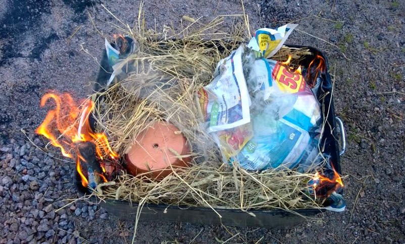 Man fyller ett metallkärl med tidningspapper i botten, och formar till en ”stubintråd” av papper till varje hörn.