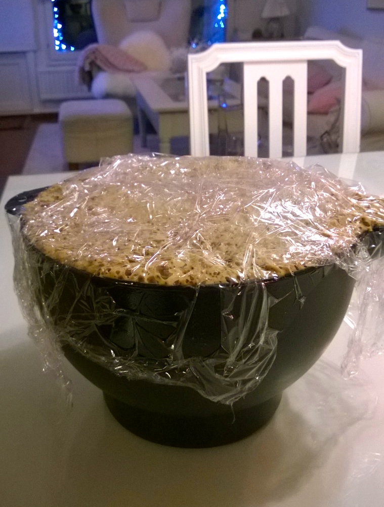 Häll över i en stor bakbunke och rör i alla de övriga ingredienserna. Låt degen stå och jäsa i 1,5 timme.