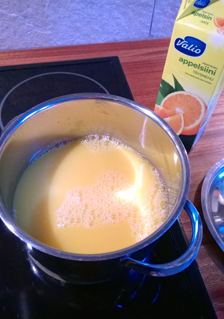 Värm apelsinjuicen till ca 37 grader (fingervarmt). Smula i jästen och blanda.