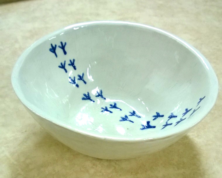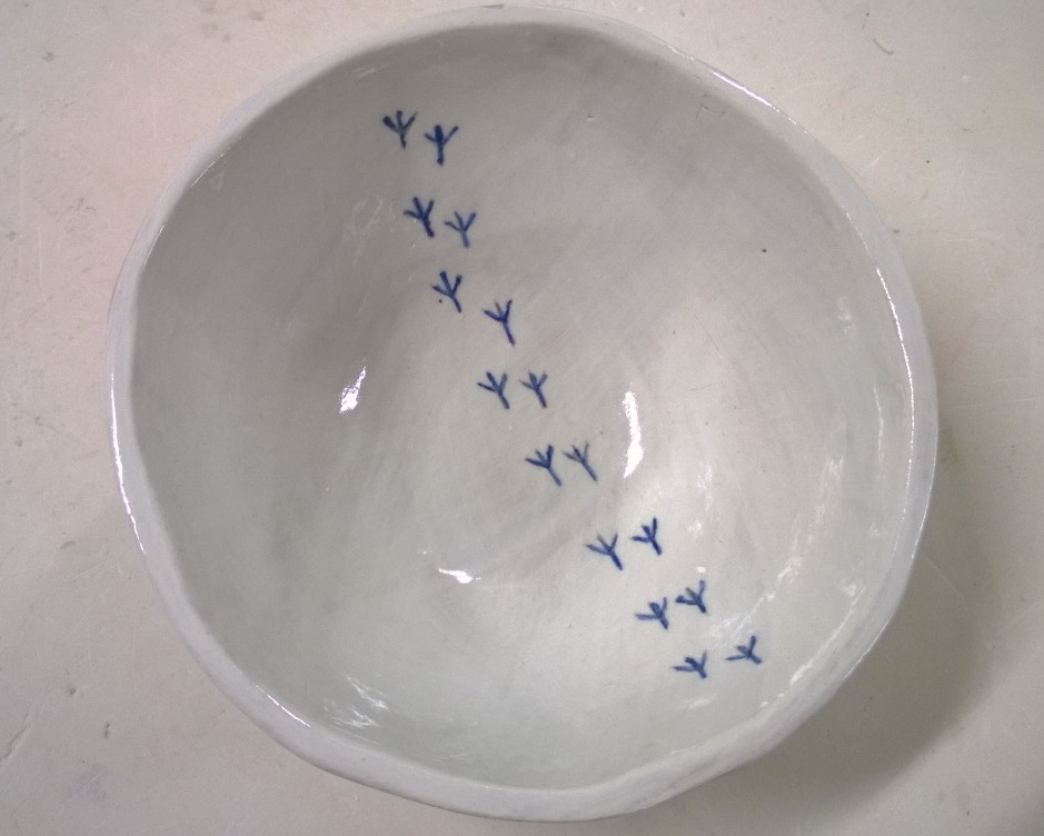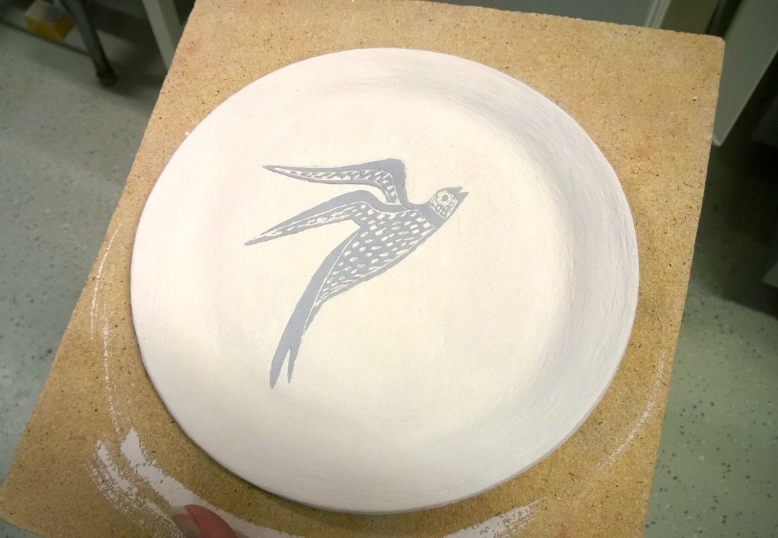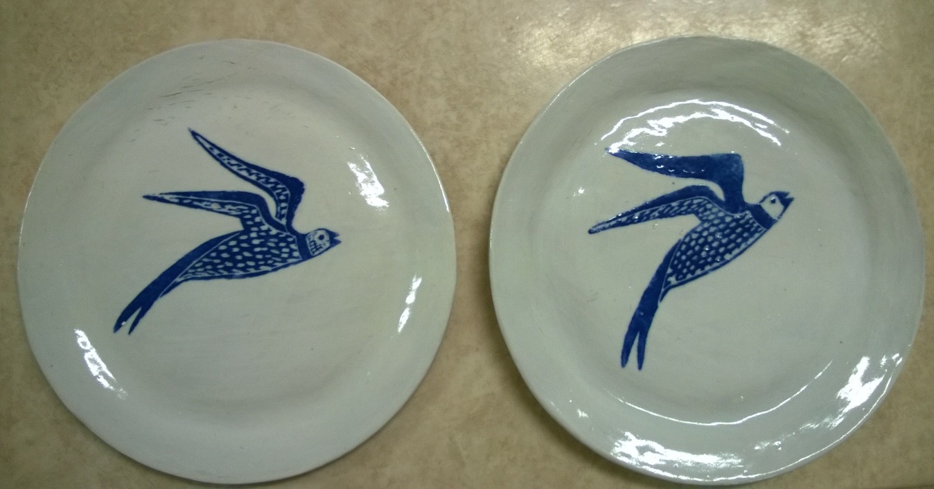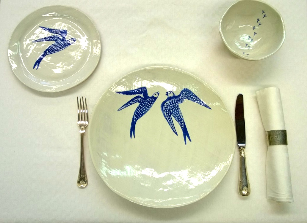 Jag fick inspiration till det flygande fågelparet från den minoiska kulturen på Kreta och Santorini, och väggmålningarna där. Förverkligade dekoren med schablon och sgraffito (=skrapteknik) i vit och koboltblå engobe.