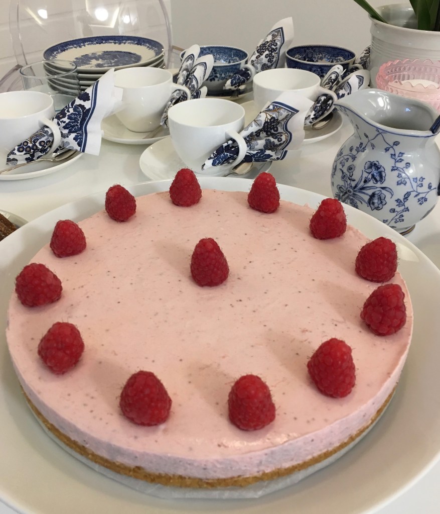 Jordgubbscheesecake med hallon som dekoration. Alla varianter på den här kakan är lika goda…! /Anni
