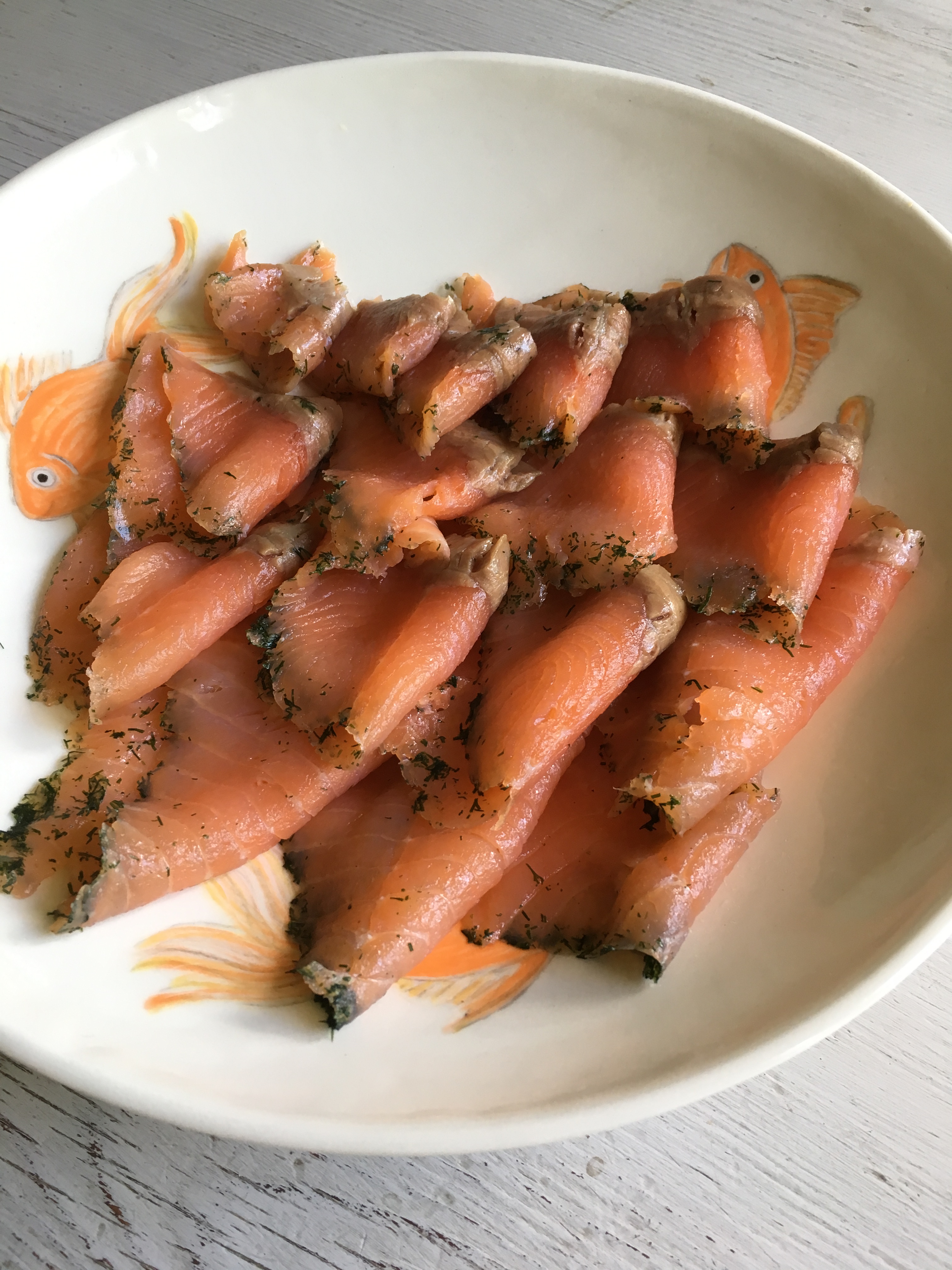 Låt härligheten marinera i kylskåpet i minst 1 timme. Ju fler timmar desto godare förstås… Servera med kokt nypotatis och en fräsch sallad, eller på sommarens fiskbetonade buffébord. Vi åt detta på midsommaren och det var jättegott.