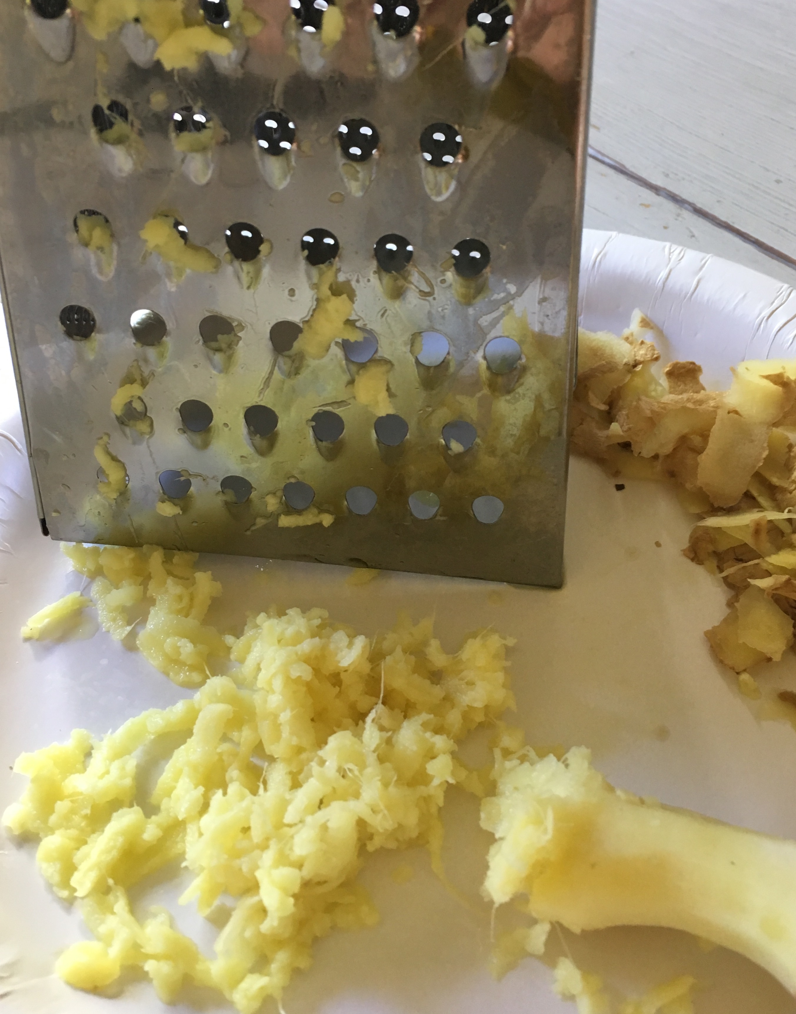 Riv några cm av ingefäran grovt med ett rivjärn. Blanda ner den rivna ingefäran i marinaden.