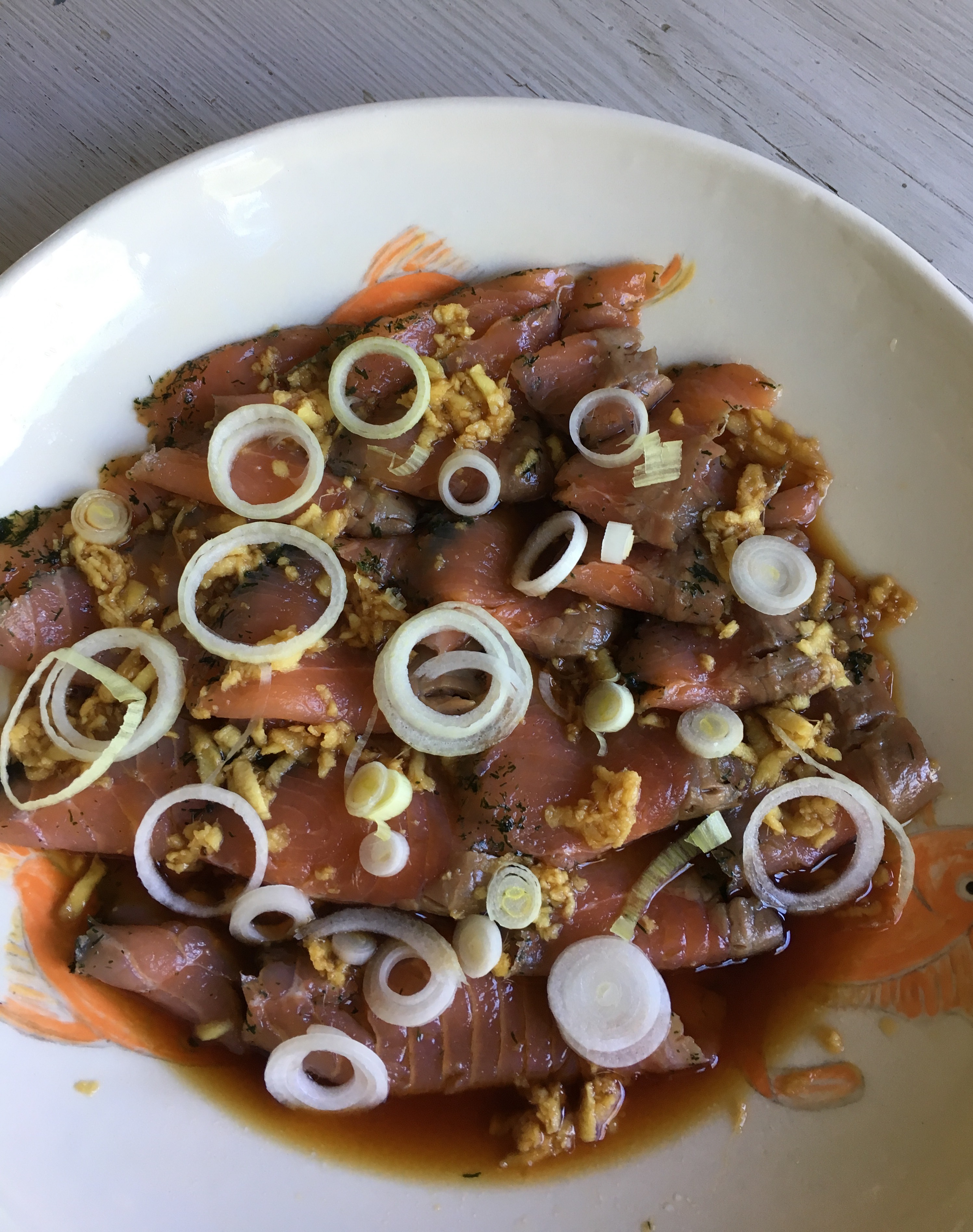 Rada upp laxskivorna snyggt omlott på fatet. Gör marinaden.