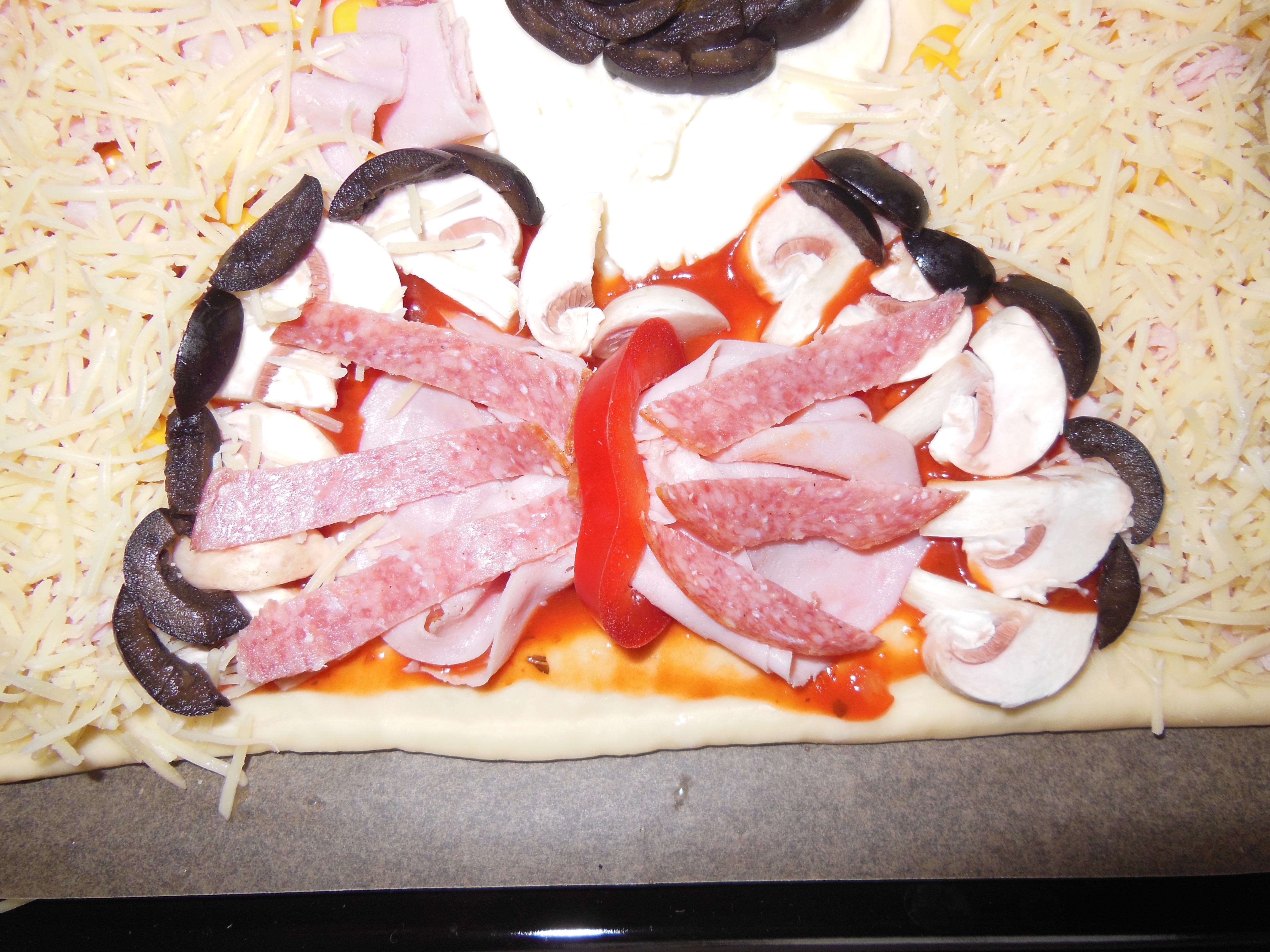 En ”rosett” under hakan av paprika, skinka och salami. Konturer och mun av svarta oliver skurna i tunna strimlor. För smakens skull fyllde jag på med skinka utanför konturerna och sen riven ost.