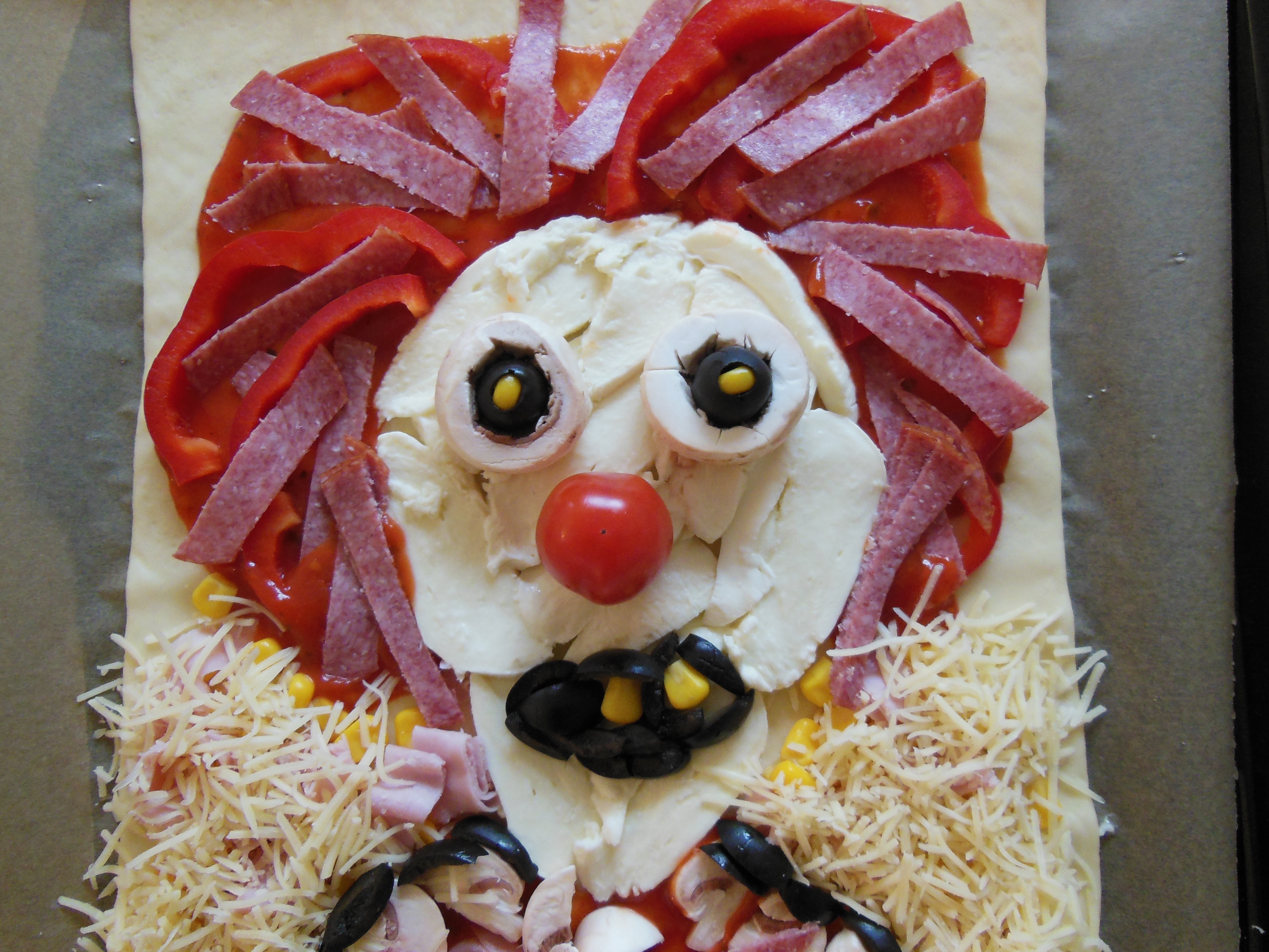 Jag rullade ut den färdiga degen på bakplåtspapper. Ansiktet är av mozzarella. Jag började med att rista in huvudets konturer i degen och fyllde sedan på med tunt skuren mozzarella. Strök därefter ut en röd sky av hår = tomatsås, runt huvudet och som överkropp. Gjorde mer hår av röda paprikastrimlor och salamistrimlor. Ögon av champinjonring med en halv oliv och ett gult majskorn i varje öga.