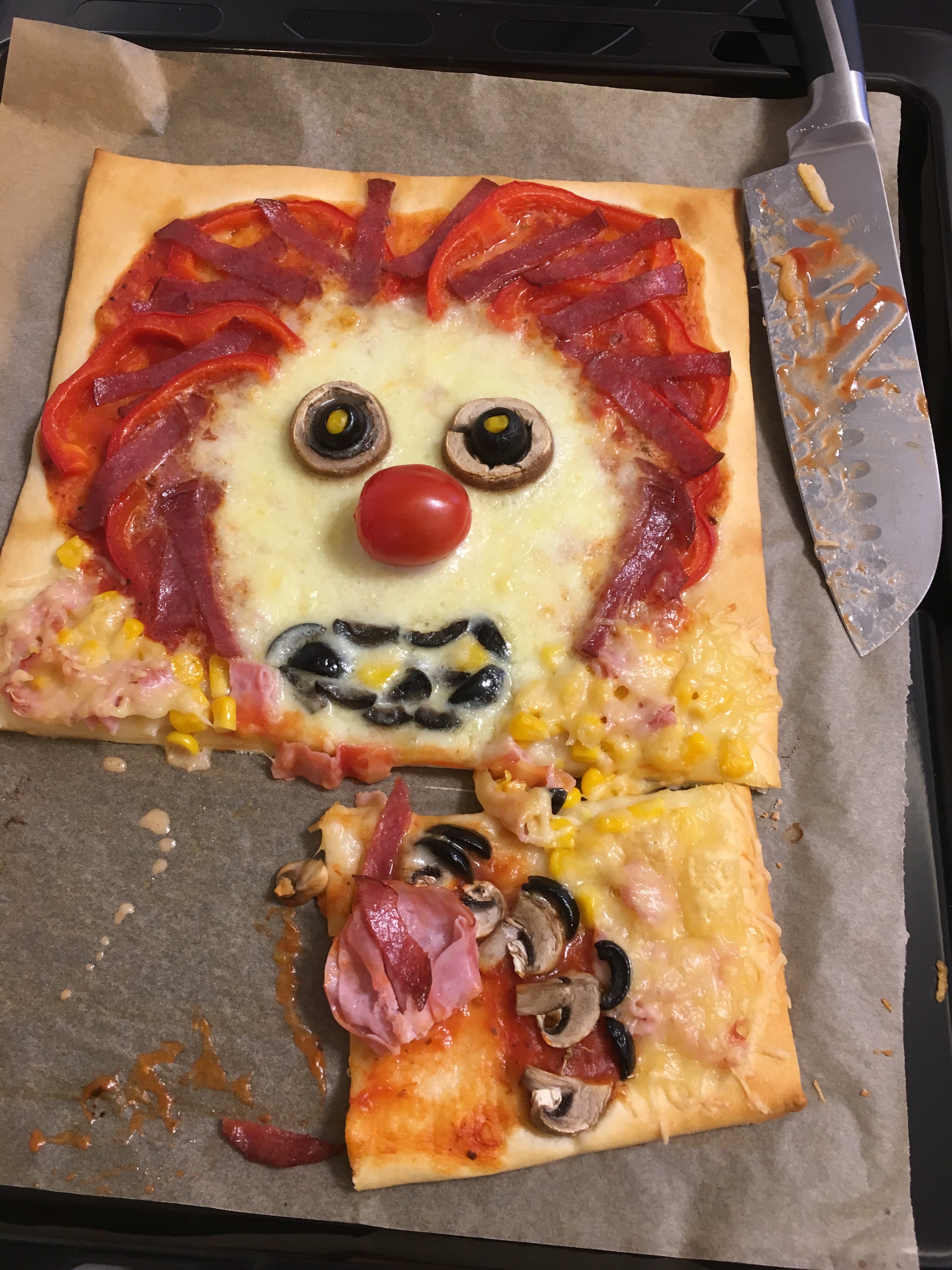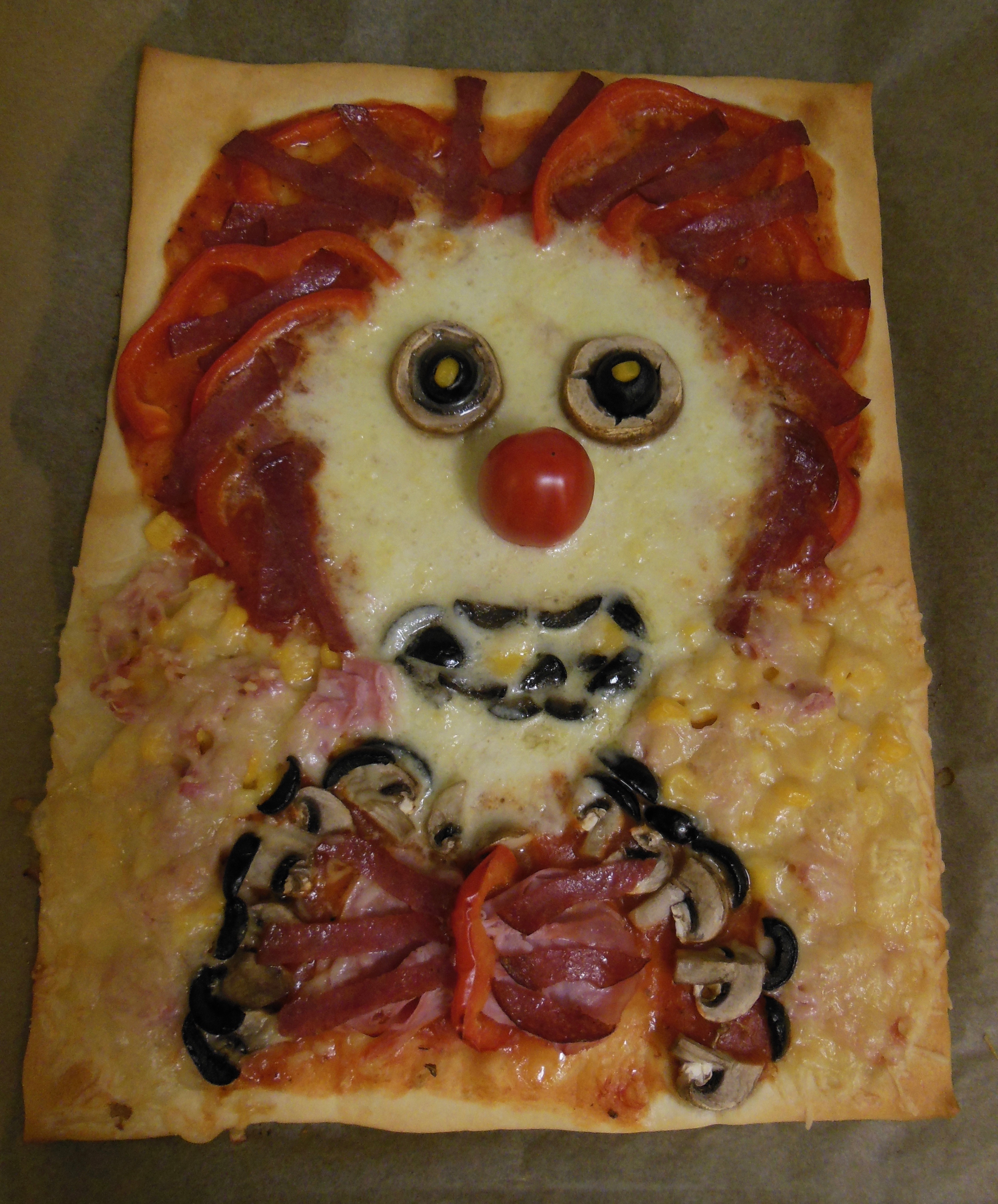 Ser pizzan inte tillräckligt hemsk ut? Vänta bara tills den varit i ugnen och fejset smält… I ugnen fick clownen stekas utan näsa, den tryckte jag in i ansiktet till sist.