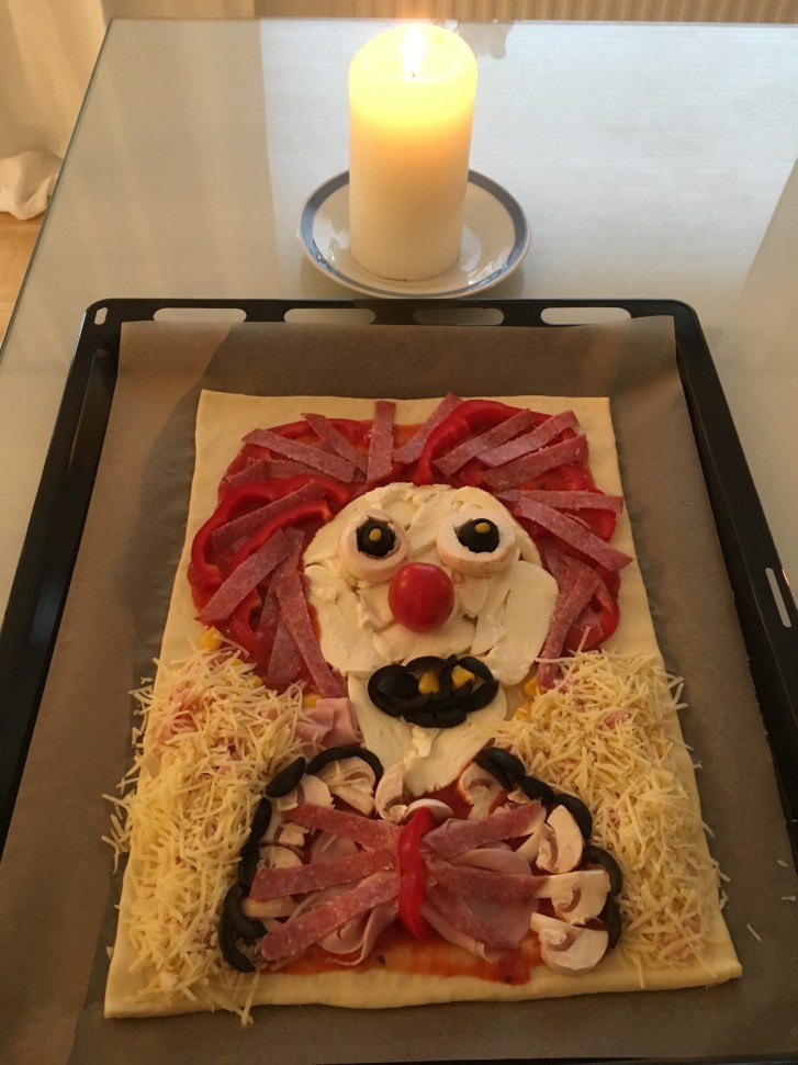 Inspirerad dels av skräckfilmen Det – It på engelska – som jag inte sett och inte vet om jag vågar se, och dels av Halloween, lagade jag en hemsk clownpizza. Det var barnsligt roligt att göra Det.