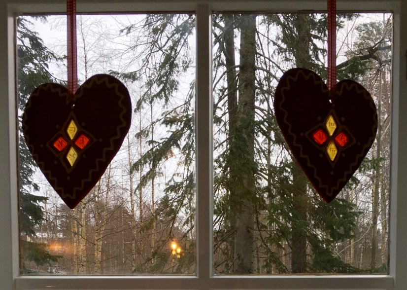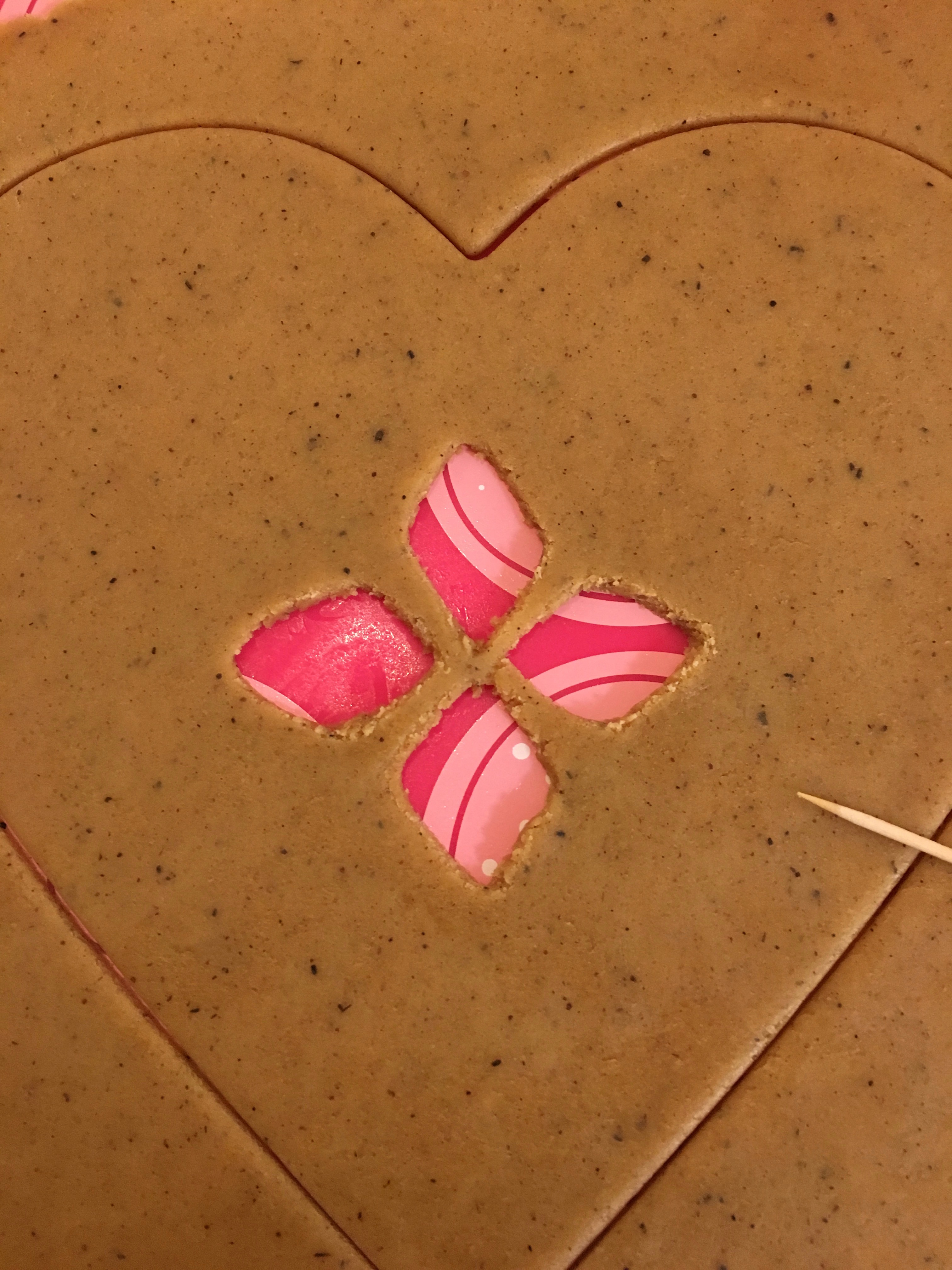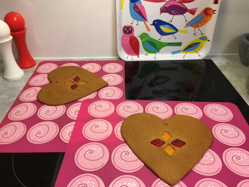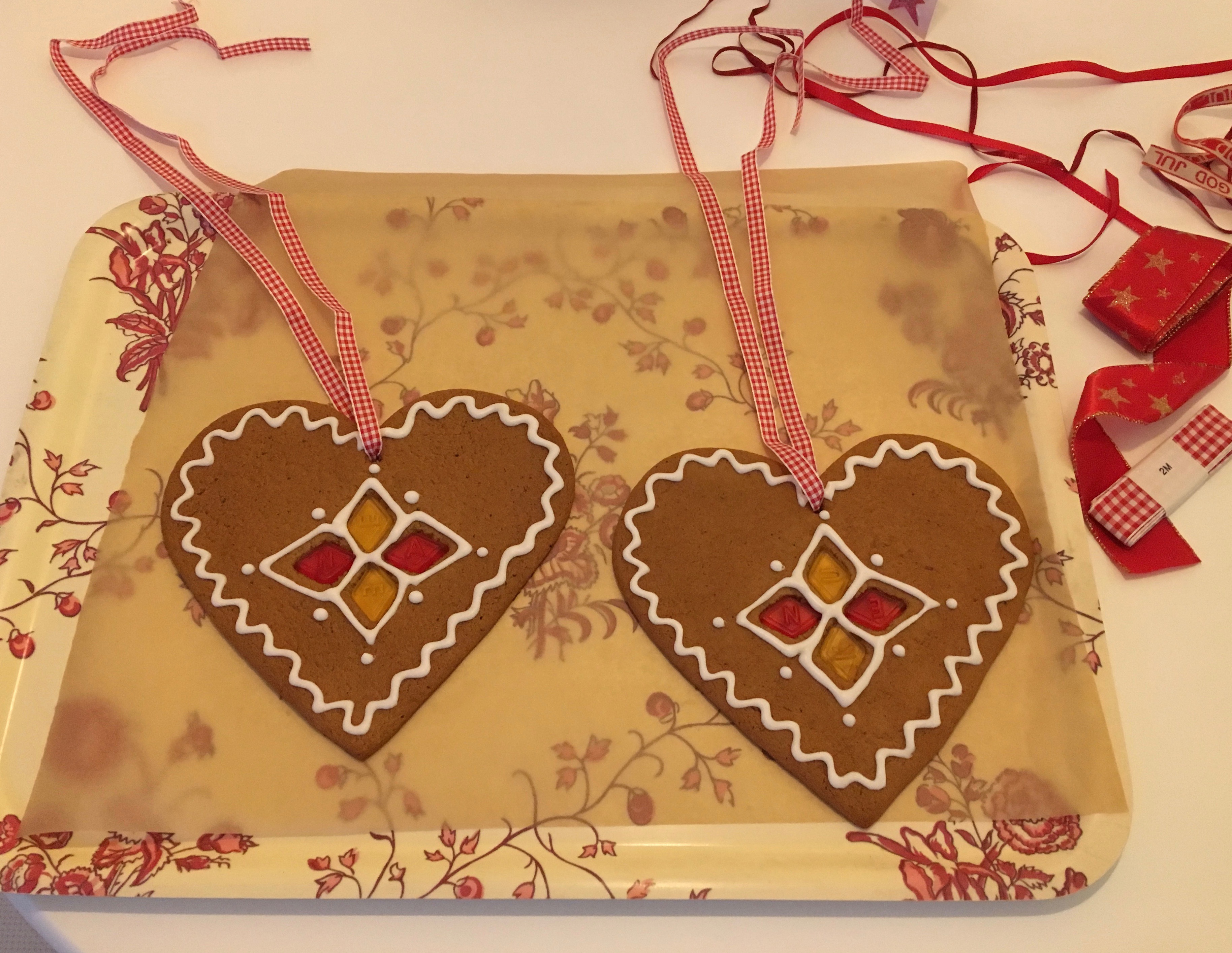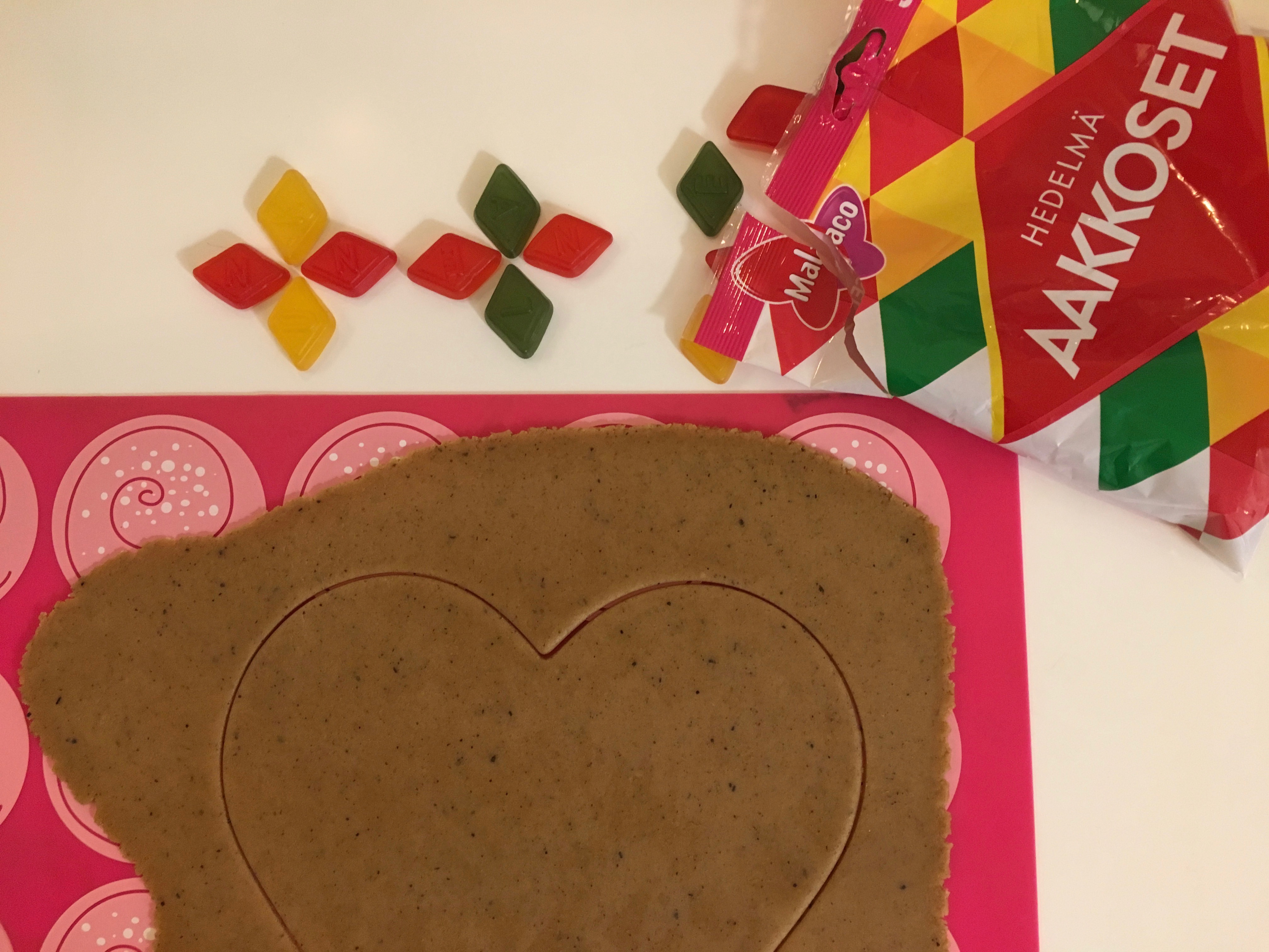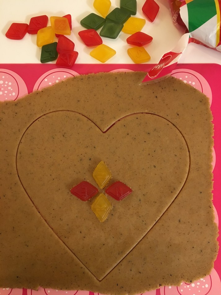 Om man fäller in fruktgodis i pepparkakor får man en trevlig intarsiaeffekt. Jag brukar varje år göra två stora hjärtan att hänga i fönstret. Det som behövs är förstås en stor hjärtform: