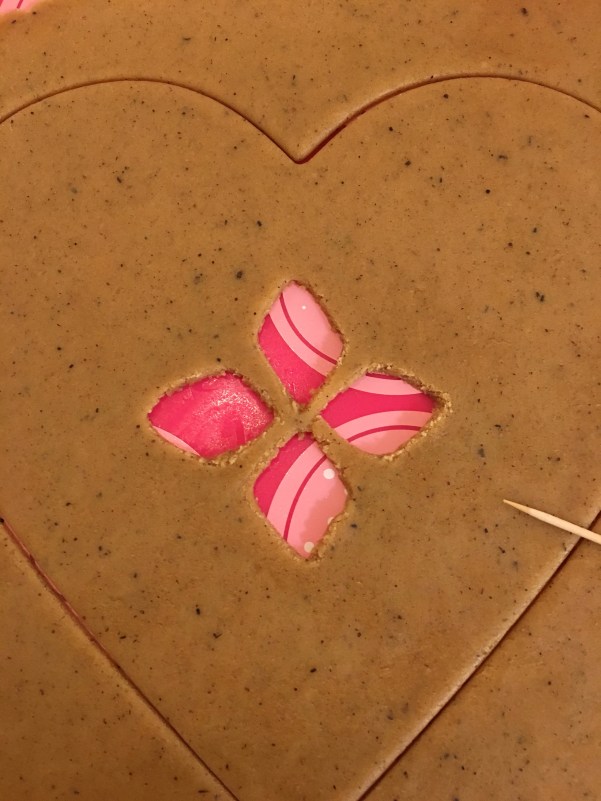 Sedan skar jag ut enligt konturerna och lade godiset i hålen. I ugnen smälter det fast i pepparkakan. Glöm inte att göra ett hål för upphängning! Ett bra tips för snyggt hål är att använda ett stort sugrör att stansa ut hålet med.