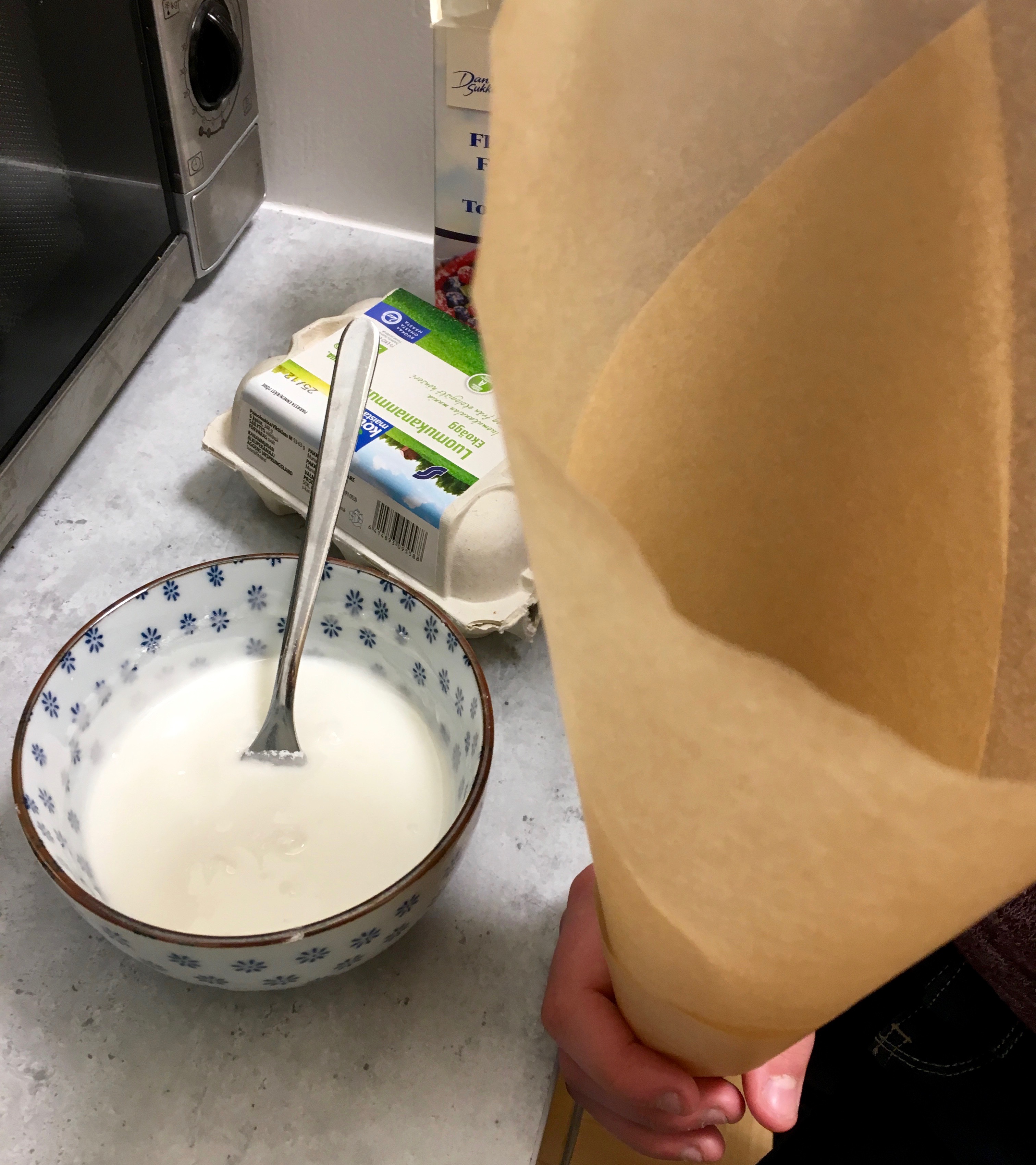 Hemlagad kristyr blir bättre den den som finns att köpa i tub. Knäck en äggvita i en skål och blanda i ca. 3 dl florsocker. Om du har ättikssprit eller citron hemma, droppa i några droppar av det för bättre hållbarhet. (Men det går också bra utan!) Jag gjorde en spritsstrut av bakplåtspapper. Virade och tejpade helt enkelt ett ark till en strut och fyllde på med kristyr.