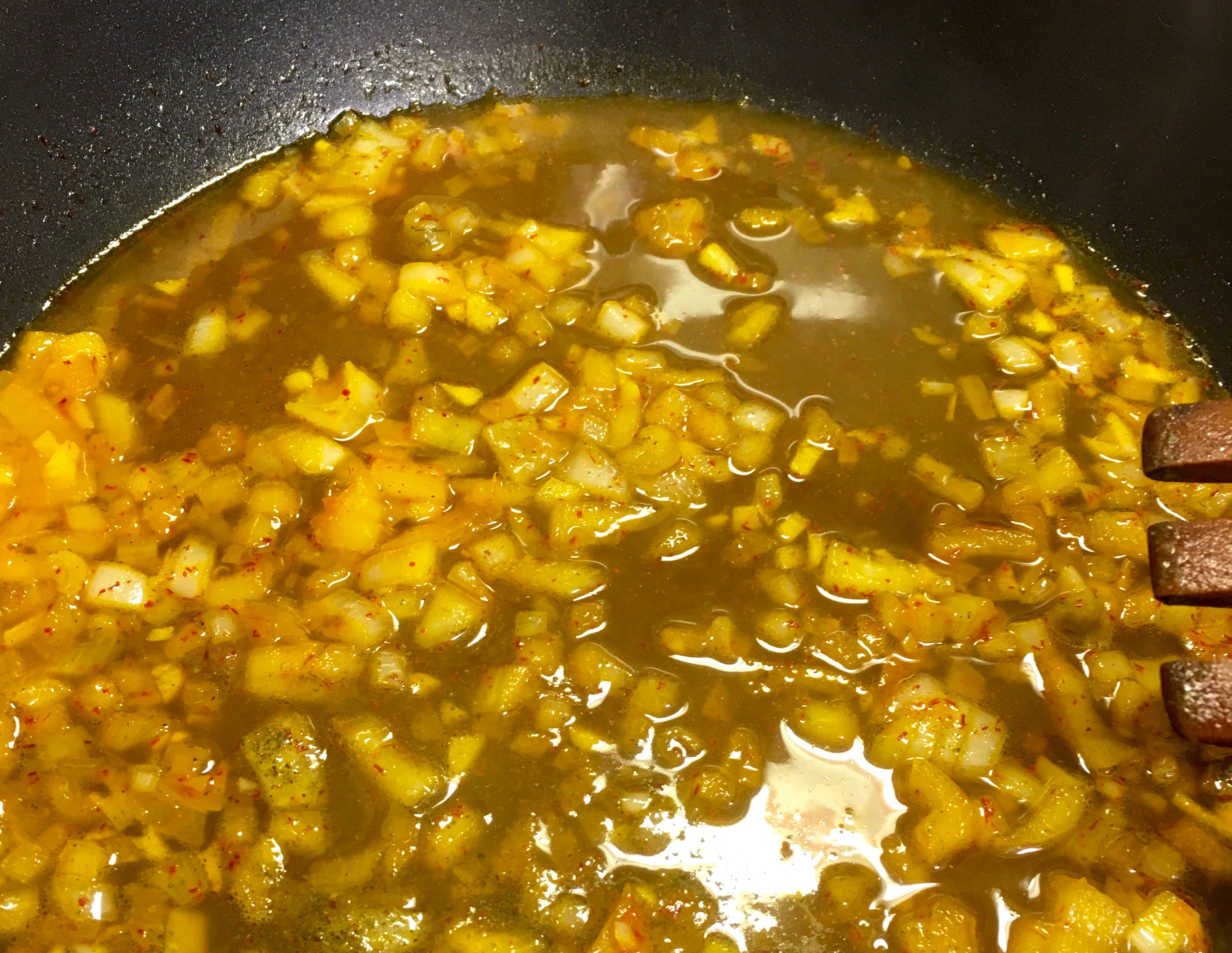 Hacka ock stek löken mjuk i smör, utan att den tar färg, tillsätt pressad vitlök, saffran, örtsalt och paprikapulver. Fräs upp kryddorna någon minut. Lös upp buljongtärningen i vattnet och häll buljongen i pannan/kastrullen. Låt puttra upp. Lägg sedan i den finfördelade laxen. Rör till sist i crème fraîche och värm upp röran på nytt, utan att koka.