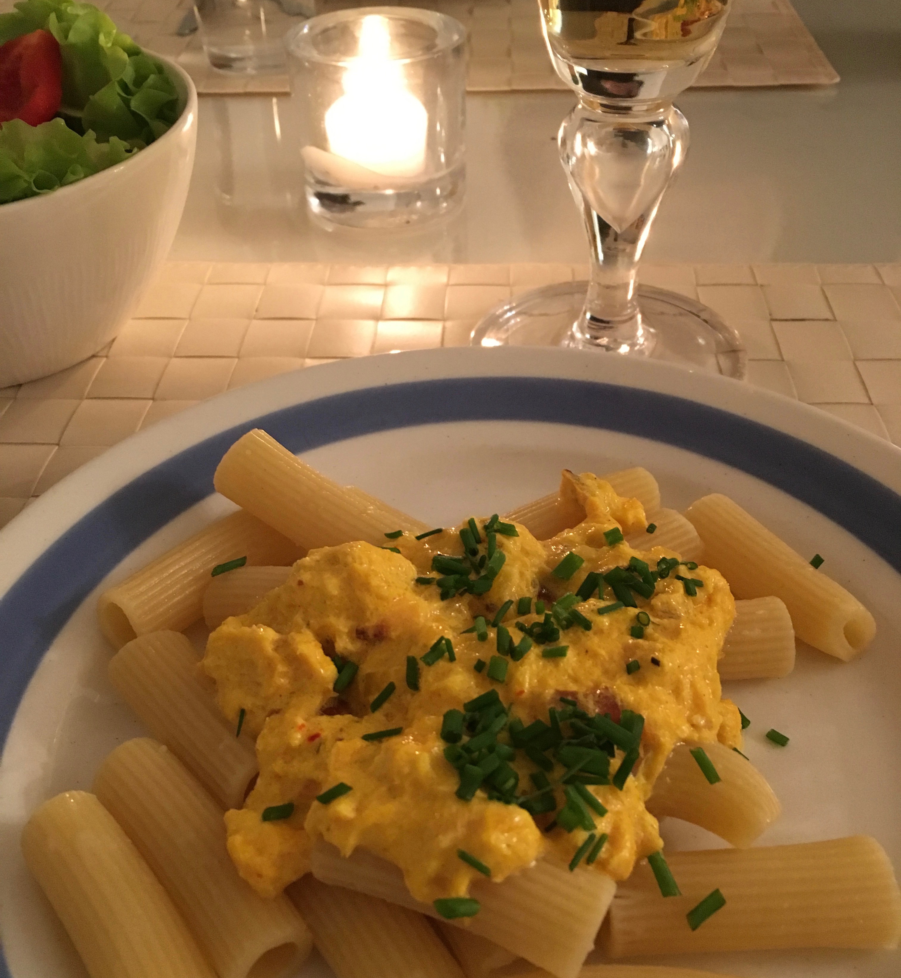 Servera med t.ex. penne eller tagliatelle. Klipp över färsk gräslök vid servering.