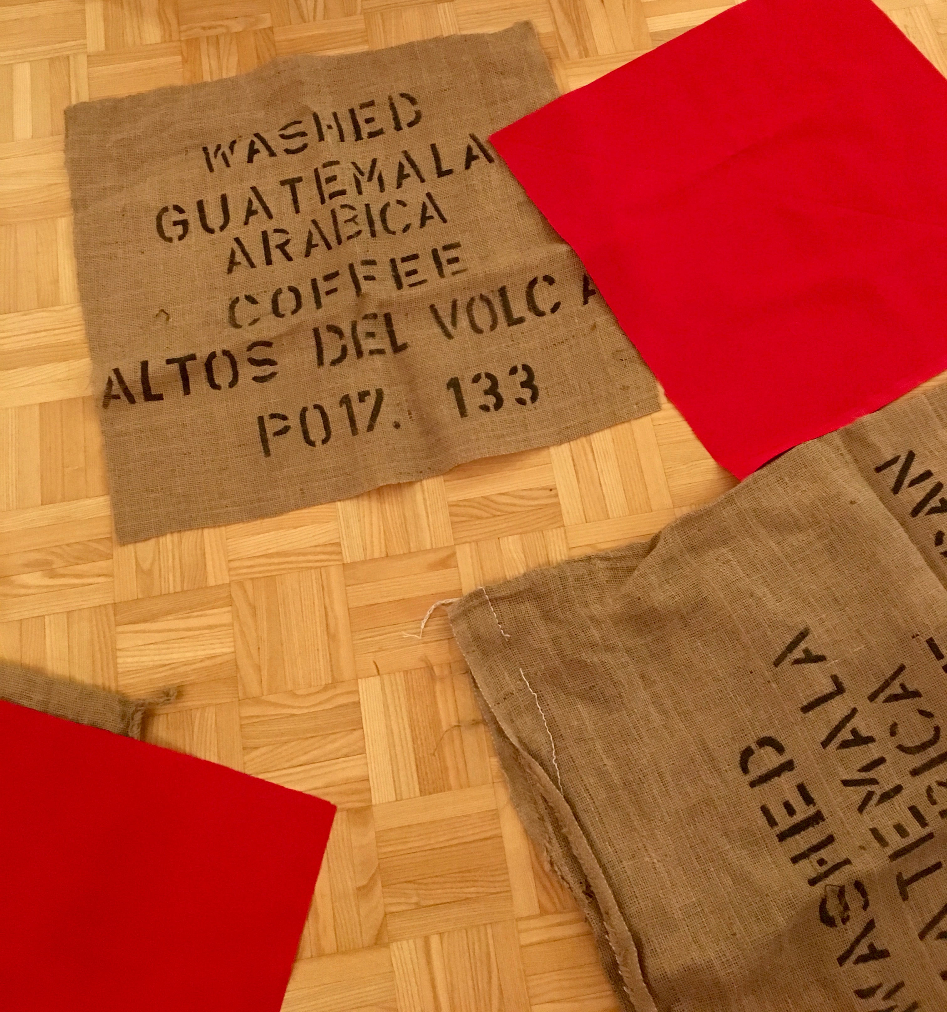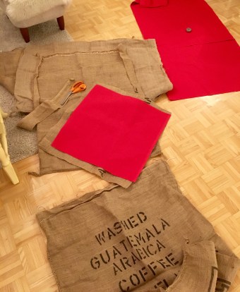 Jag hade några säckar att välja mellan. Klippte ut rutor på 54 x 54 cm ur ett rött tyg (blivande bakstycket) och lite större rutor ur de bästa säckarna.