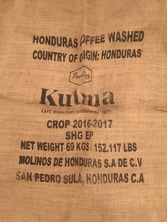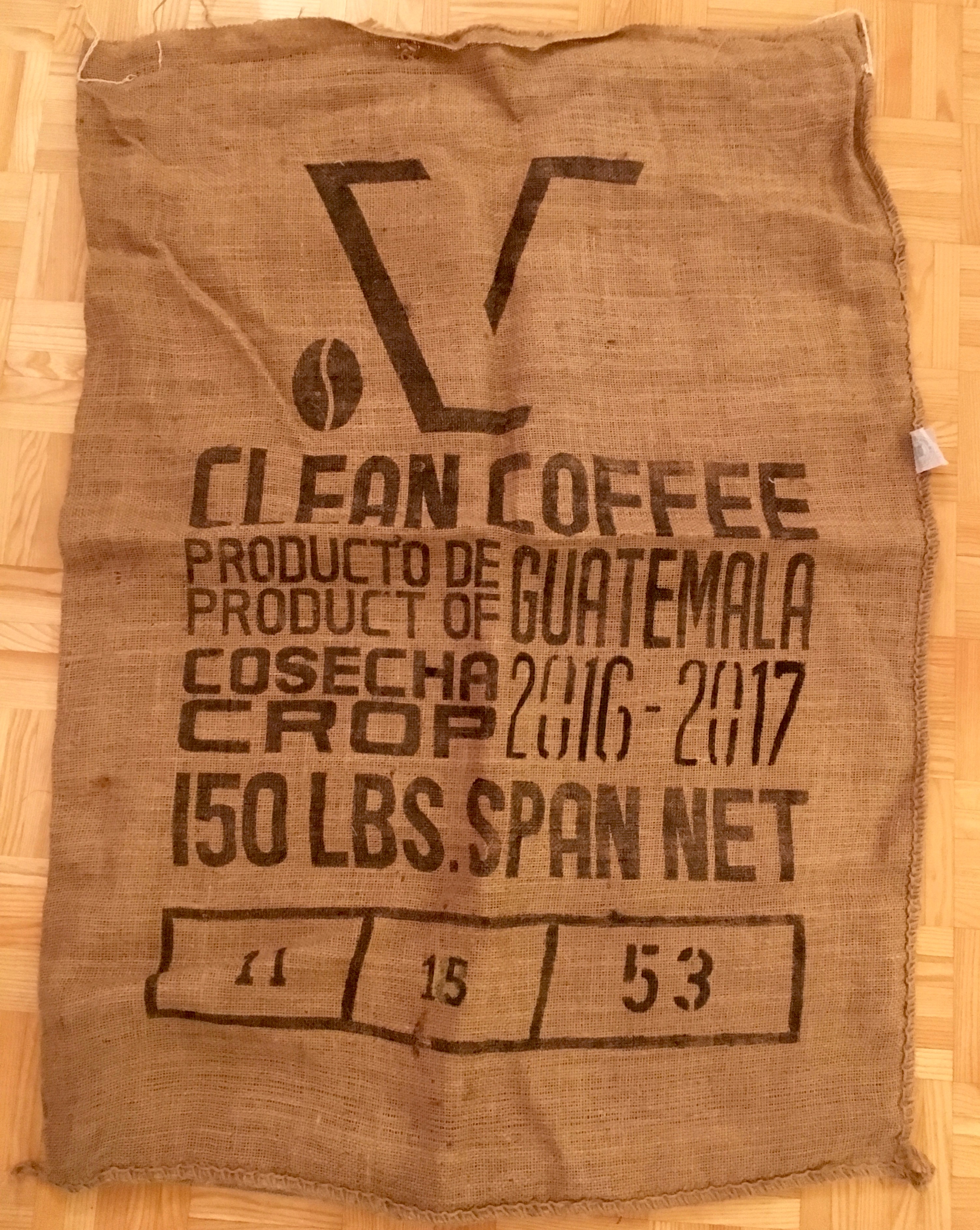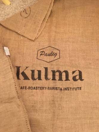 Jag bad honom hämta hem några tomma säckar. Tänkte för mig själv att om de inte är alltför smutsiga och slitna, så kan jag kanske sy nåt av dem åt honom som minne från kaffefabriken och caféet Paulig Kulma.