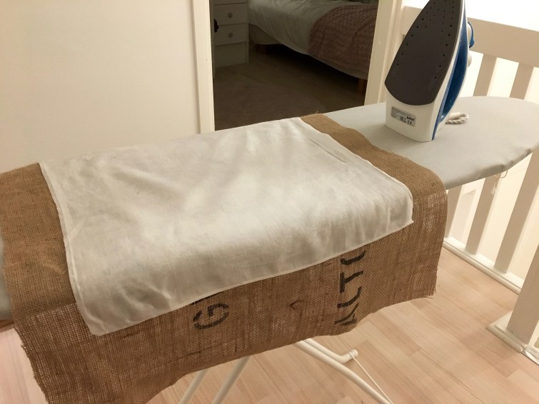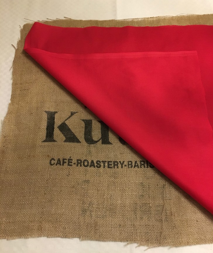 Nålade fast det röda tyget i säckväven med texten inåt.