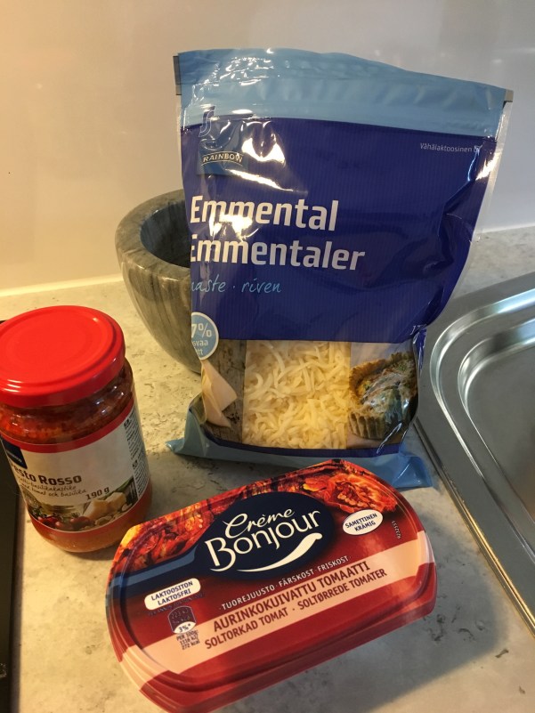 - 200 g (en ask) kryddad färskost med soltorkad tomat