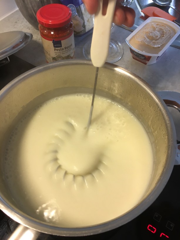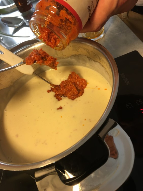 Såsen börjar tjockna. När den blivit tjock är det dags att tillsätta färskost, pesto och peppar