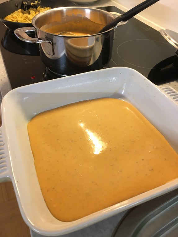 Därefter lasagneplattor och ett nytt lager av sås och andra hälften av kyckling-lökröran.