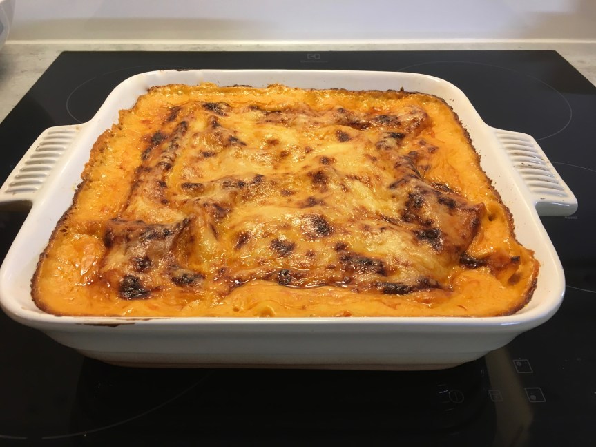 Därefter lasagneplattor och avsluta med det sista av såsen! Tadaaa! Nästan färdigt! Toppa med lite riven ost och ugnsgrädda i 200 grader i 45 minuter.