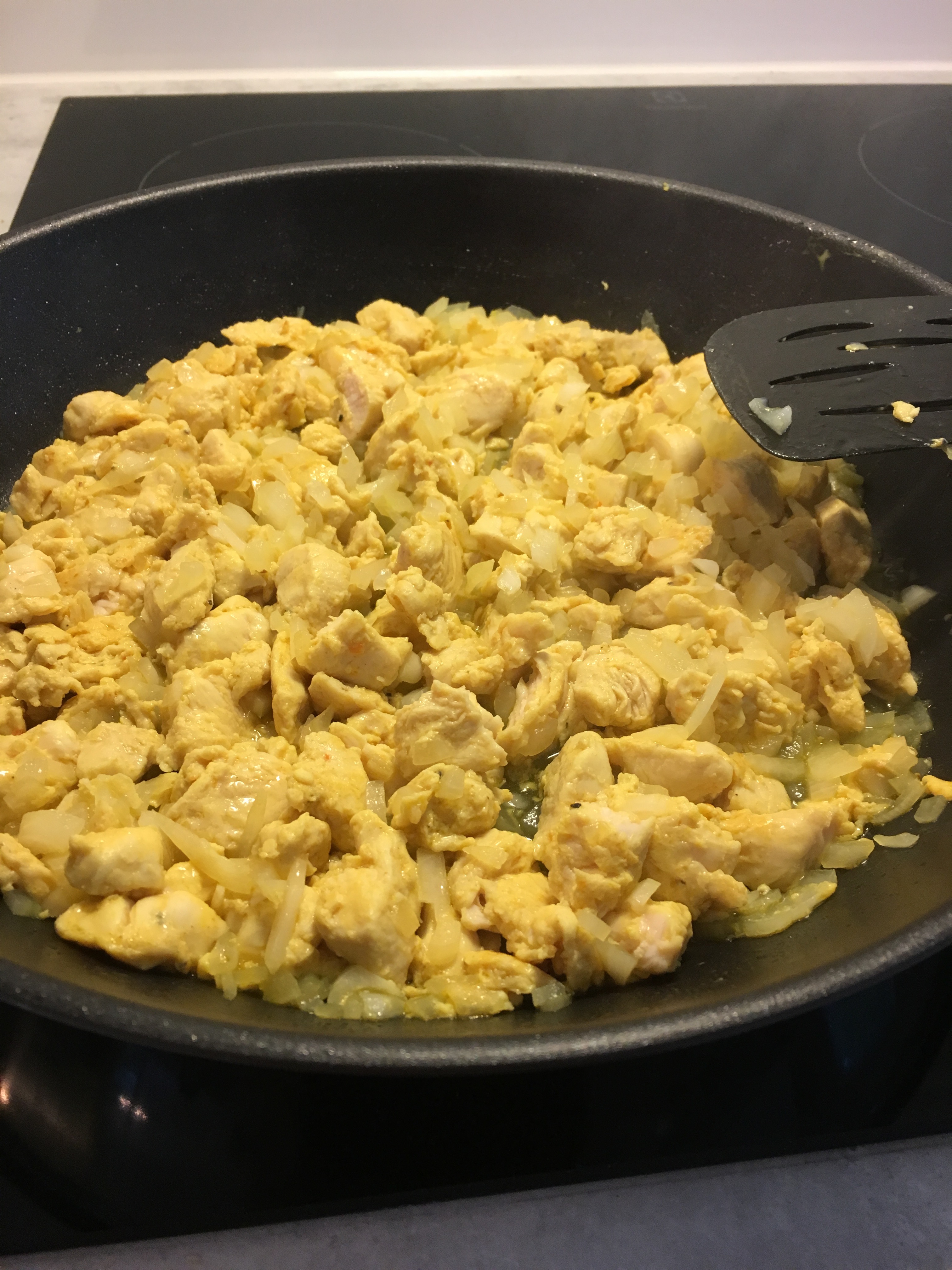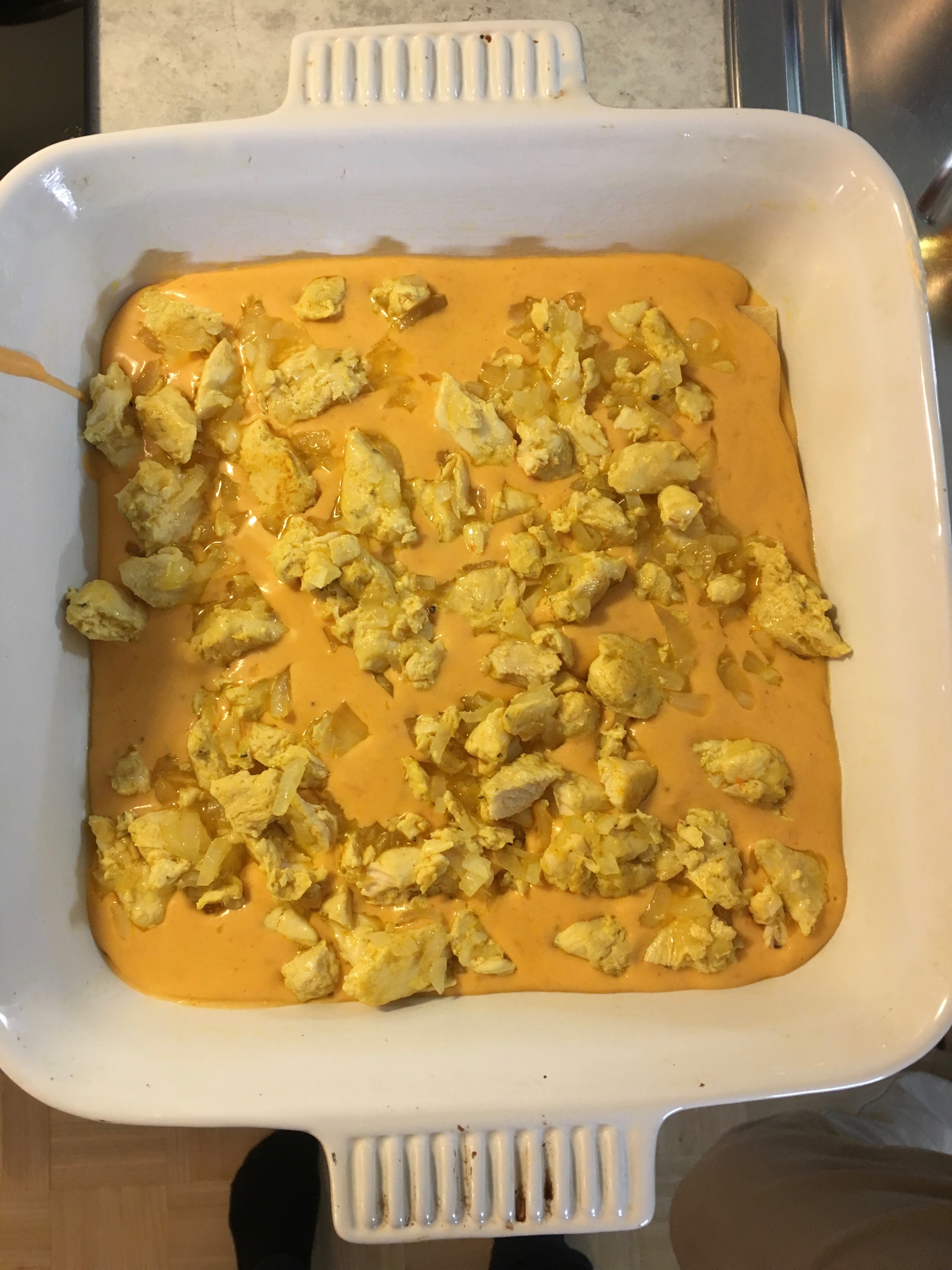 Sedan följer ett lager med sås igen och ovanpå såsen hälften av kyckling-lökblandningen.