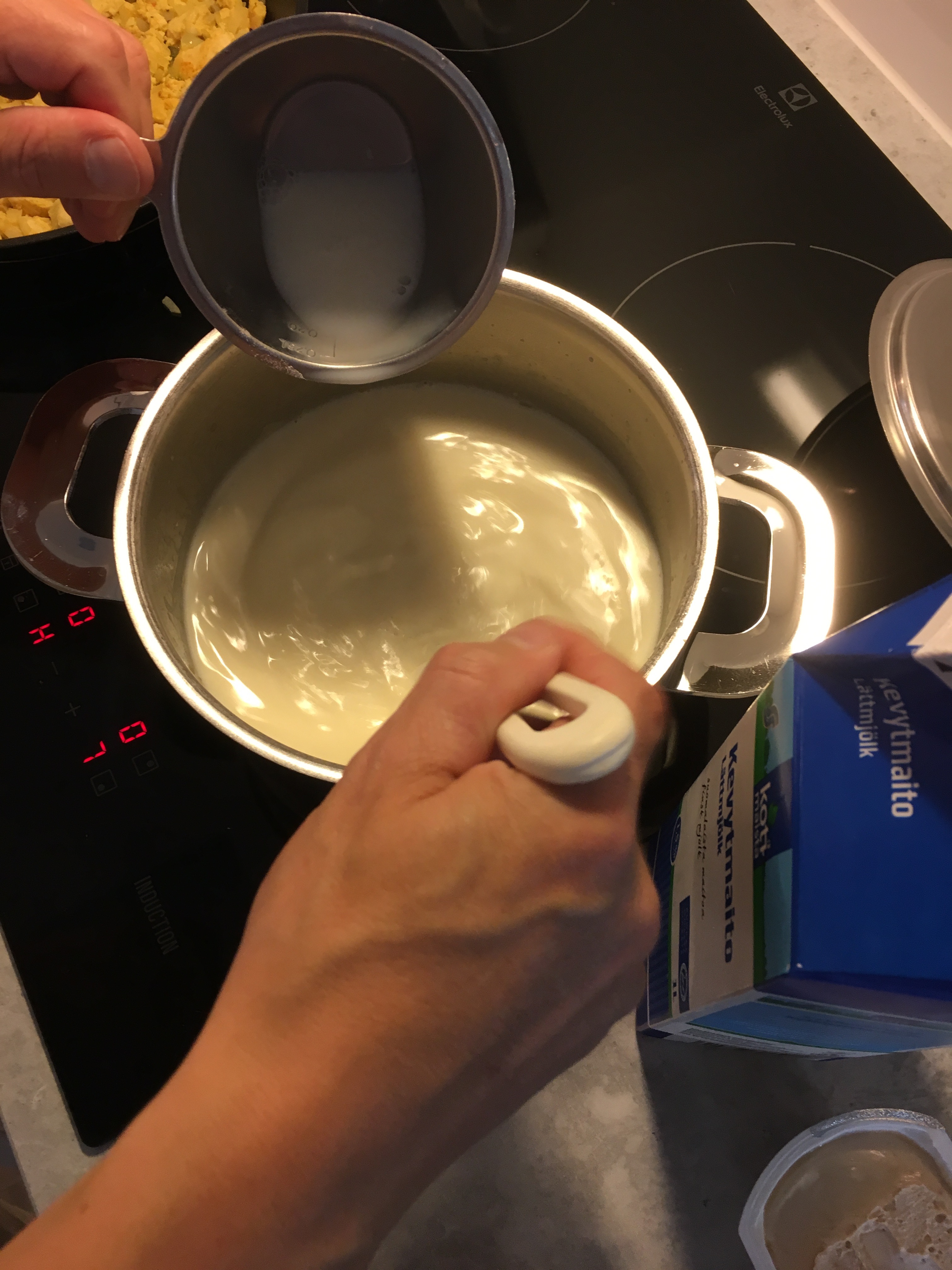 Börja sen med ostsåsen. Mät färdigt upp 8 dl mjölk. Smält därefter margarinet i en kastrull och tillsätt sedan mjölet och rör om – låt det fräsa med margarinet ett ögonblick. Häll sen på mjölken lite i taget och rör jämnt.