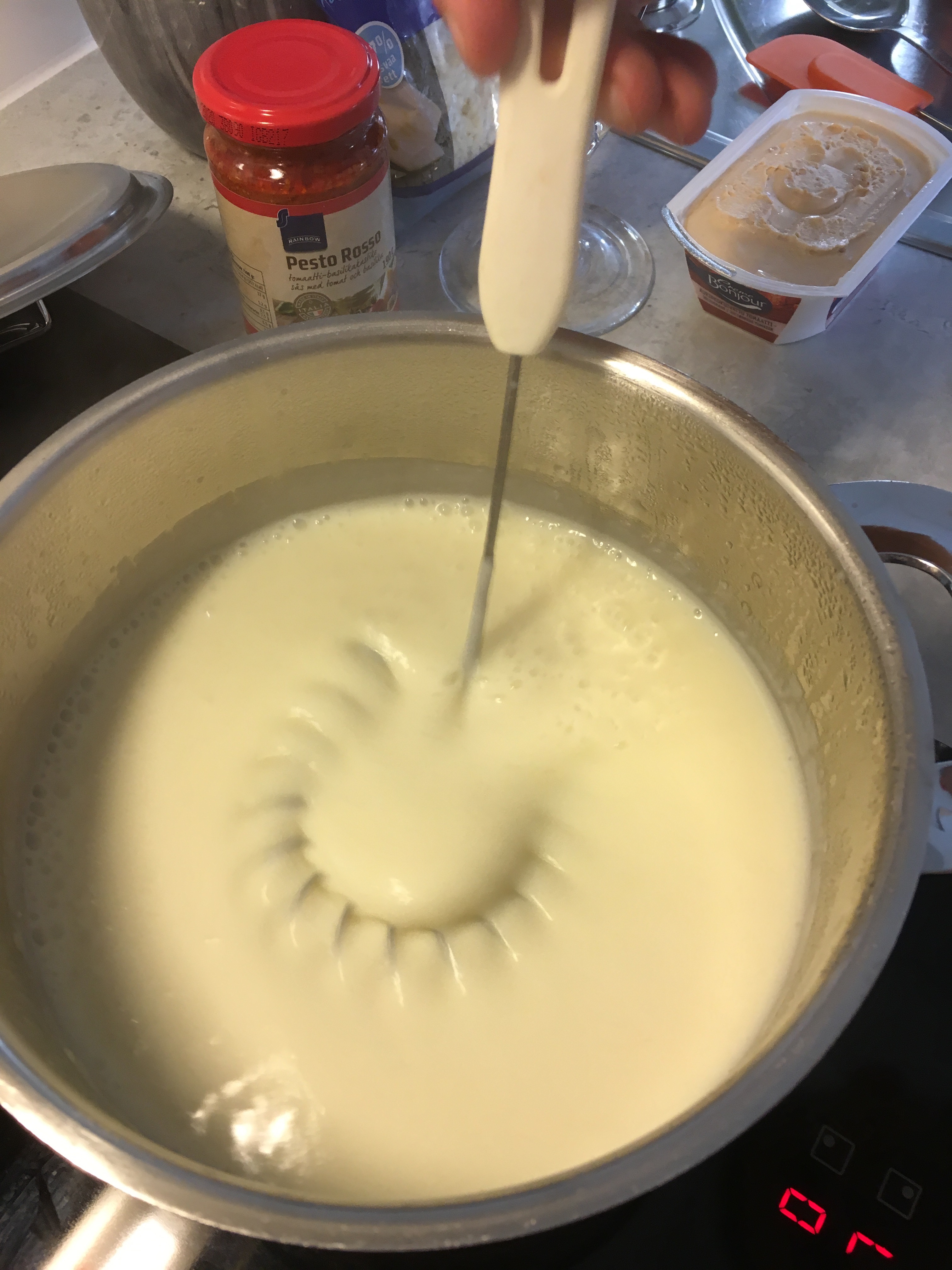 Såsen börjar tjockna. När den blivit tjock är det dags att tillsätta färskost, pesto och peppar
