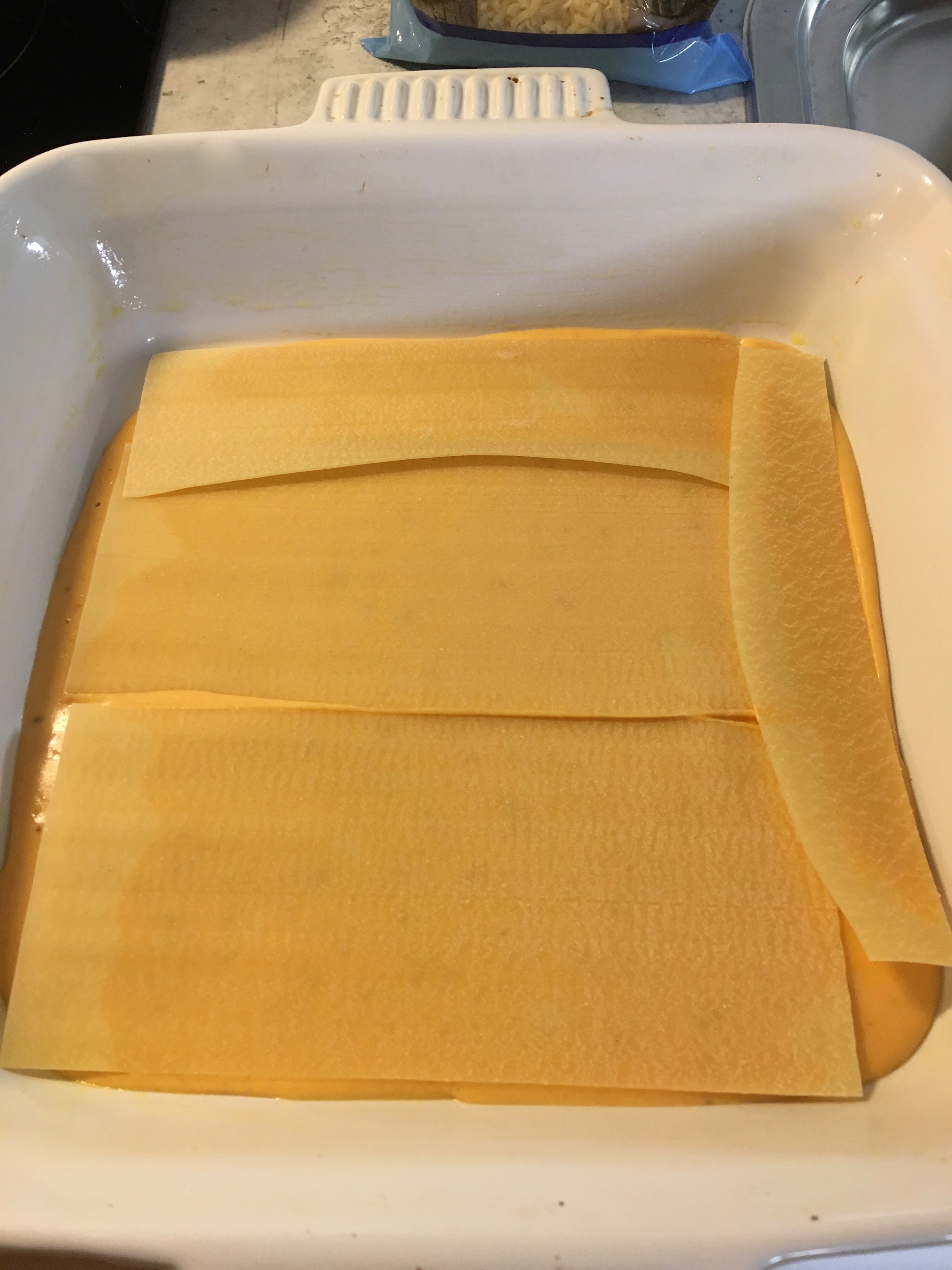 Lägg på ett lager lasagneplattor. Bryt den tredje plattan om den inte annars passar in.