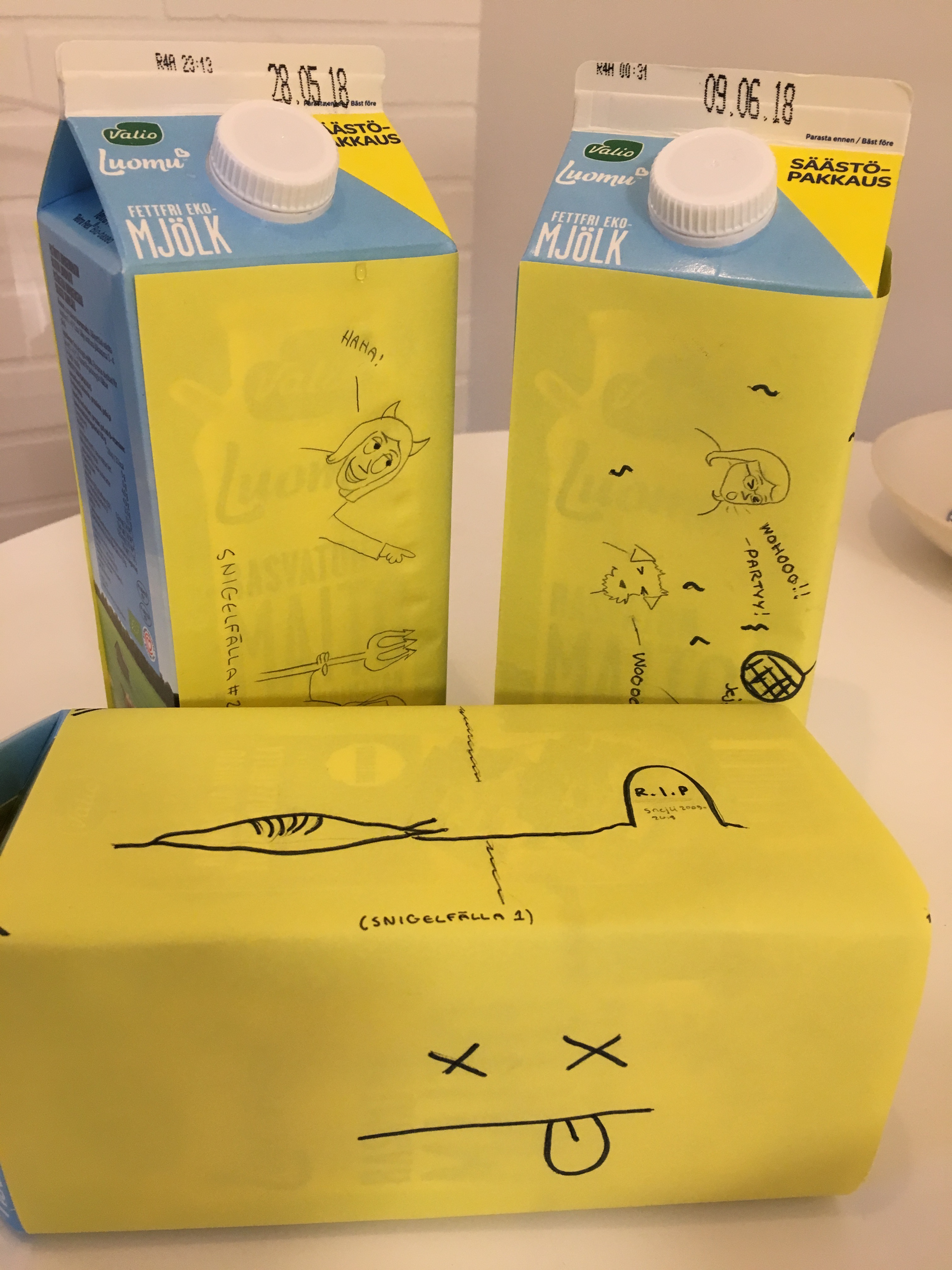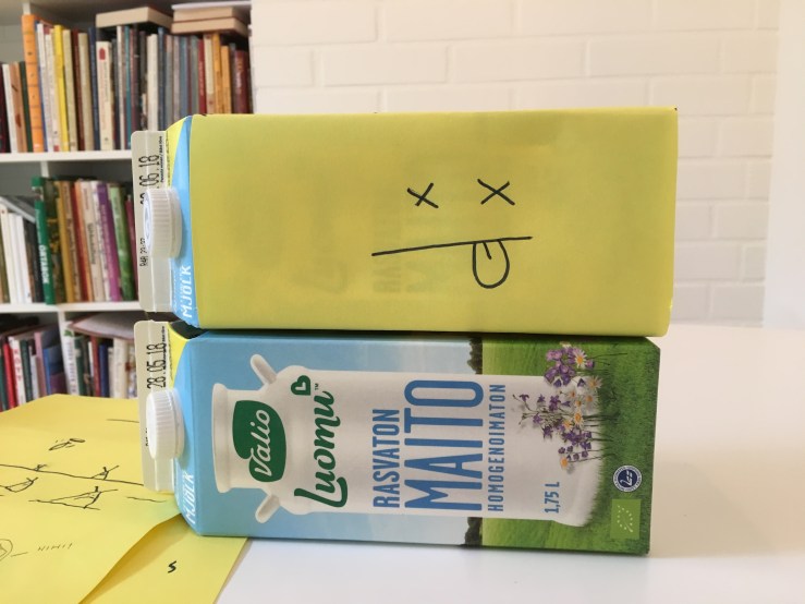 Vi tog 3 mjölktetror med skruvkork, som rymmer 1,5 liter. Dottern dekorerade dem med passande bilder…