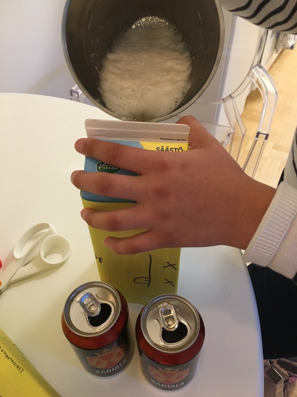 Sen var det dags att fylla på med öl. Minst 4,5% alkohol ska det vara. Vi använde Karjala och det gick åt en 0,33 l burk öl till varje 1,5 liters mjölkkartong.
