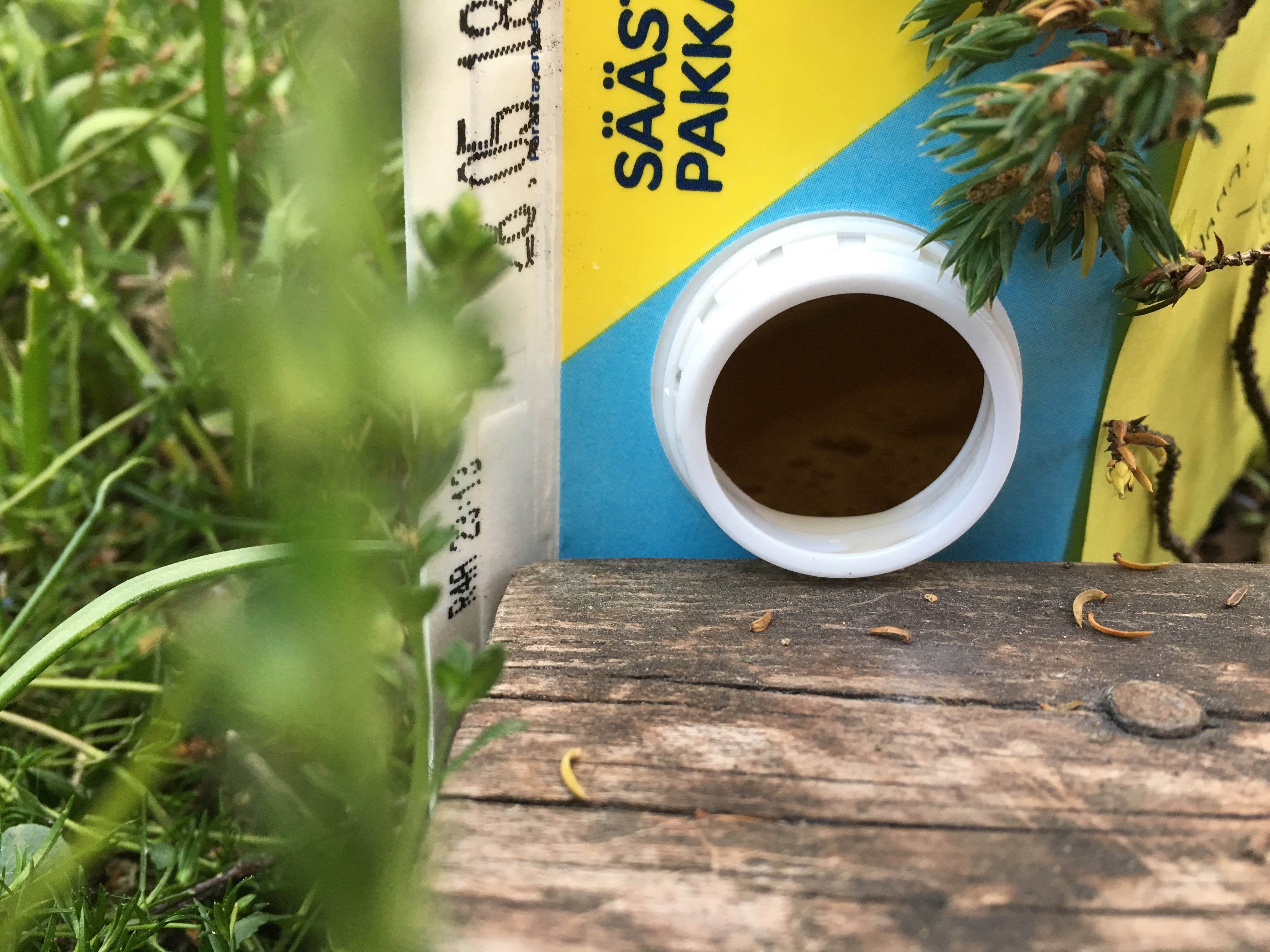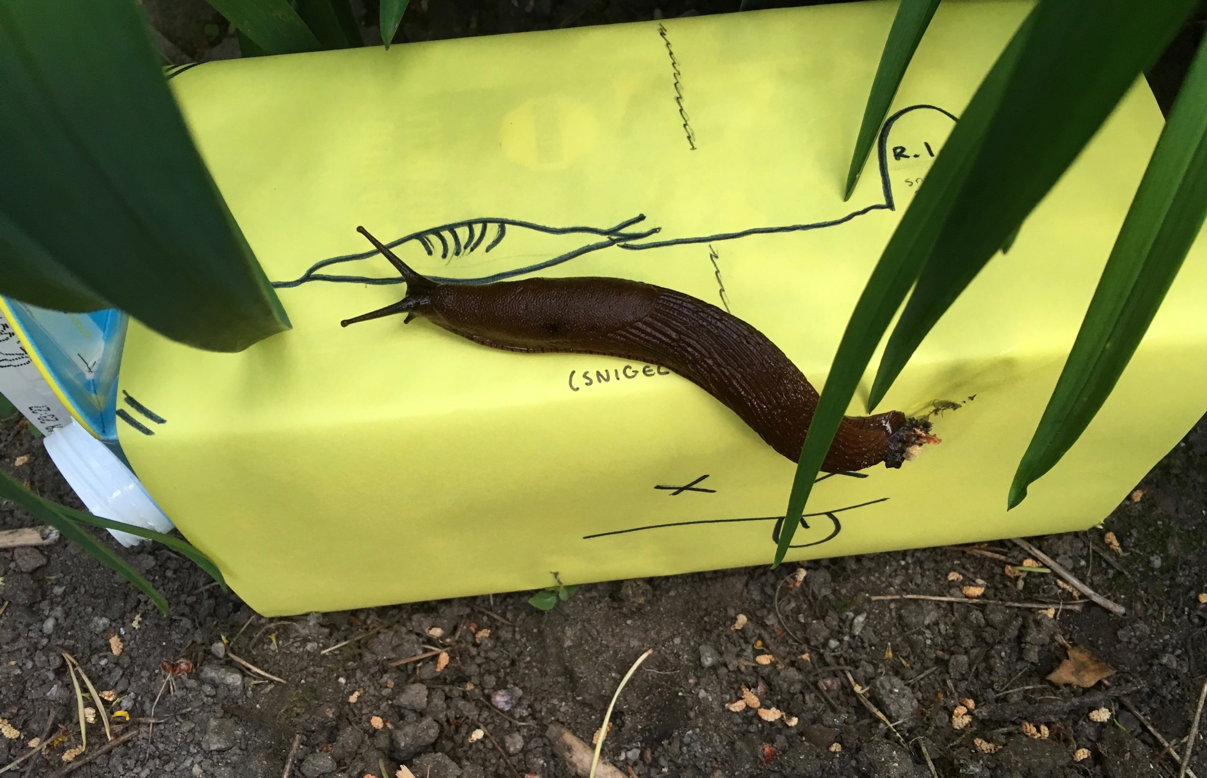 Fälla nummer 1 är utplacerad i sniglarnas farled. Nu är det bara att vänta.