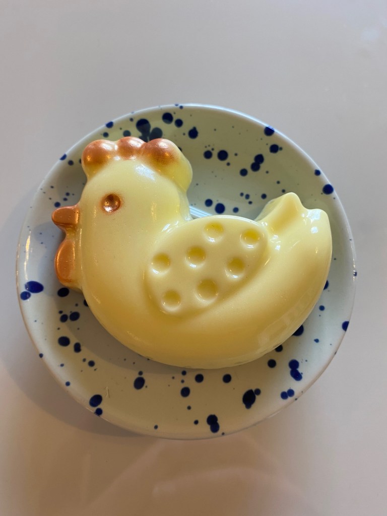 Jag lagade två tvålar till påsk av s.k. Melt & Pour tvålmassa med getmjölk. Det blev två väldigt påsksöta tvålar till gästtoaletten. En gul höna med doft av apelsin, mandarin och citron…