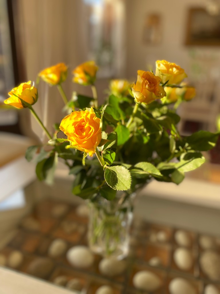 Och gula rosor. I soffbordet har jag också ägg, året om.