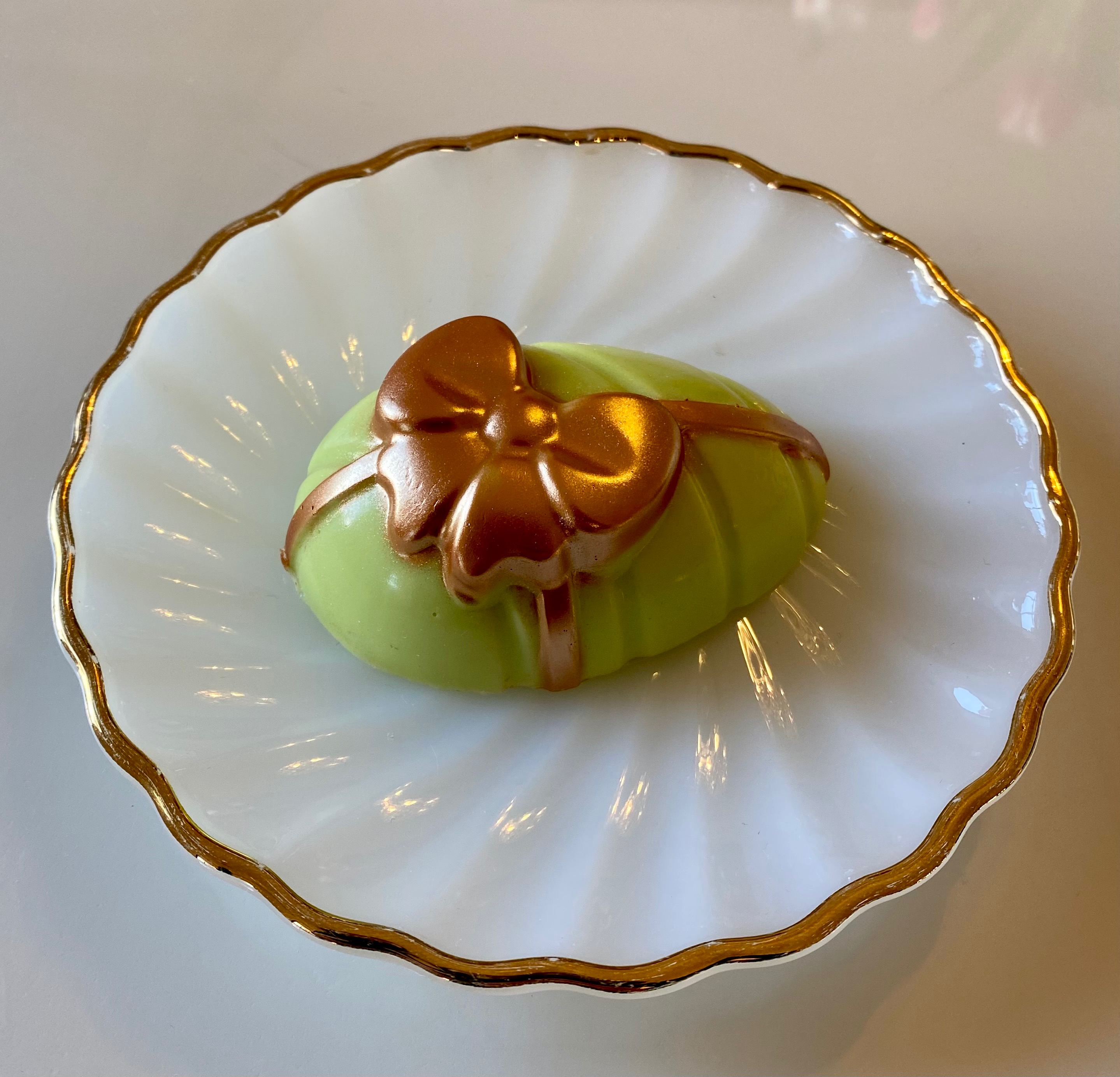 …och ett ägg! Ägget fick samma doft, men det färgade jag grönt. Jag färgsätter tvålmassa med mica-pulver, det används till ögonskugga, läppstift och annan kosmetik inom skönhetsindustrin. Sen penslade jag på lite guldpulver av den sorten som används till livsmedel ovanpå tvålarna. Det kommer att sköljas bort när tvålen används första gången, men jag kunde inte låta bli att förgylla dem.